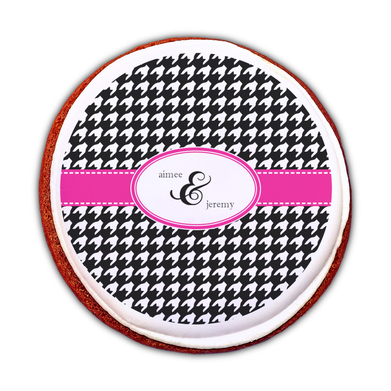 The hot pink band with a white stitch highlights the oval focal point to showcases personalization of the customer's choice.