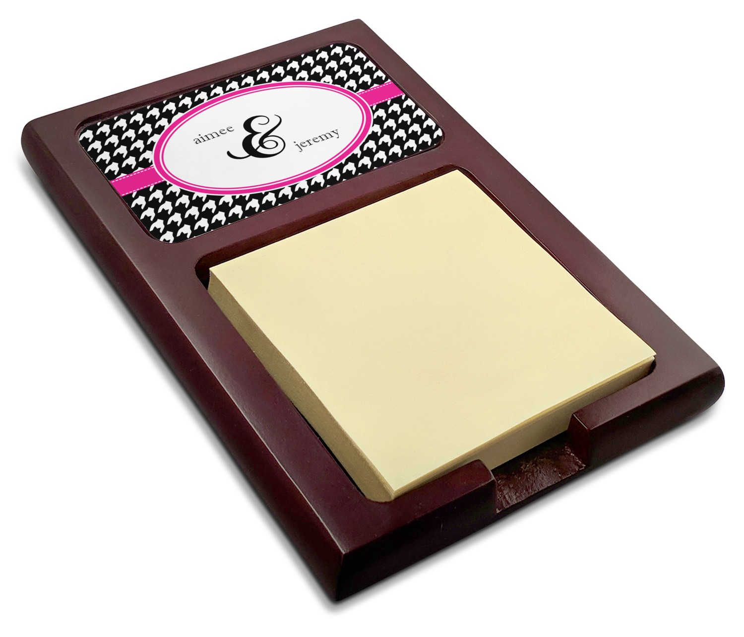 Crafted from a fine mahogany, this post it note holder is in the shade of a dark, cherry color. The dispenser itself is about 4.25 by 6.25 by 0.75 inches. You can place your 3 by 3 inch sticky notes in the indentation below the nameplate. We print your customization onto the nameplate that rests above the velvety indentation.