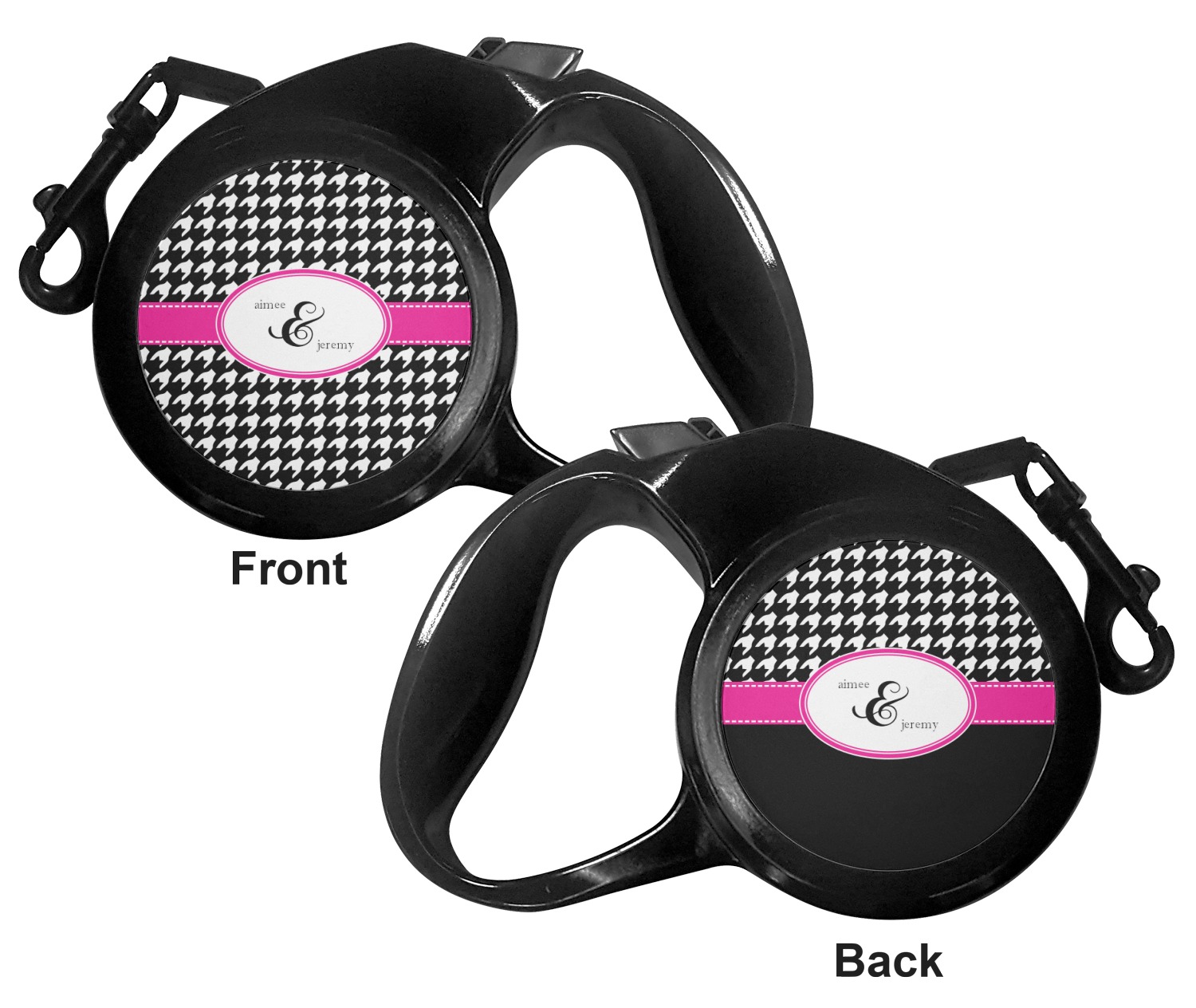 The leash's plastic handle is accommodating of your grip and displays your customization on both sides. The dog leash also features the traditional bolt snap clip, for easy fastening to your dog's collar. The leash and leash handle themselves are both black in color.