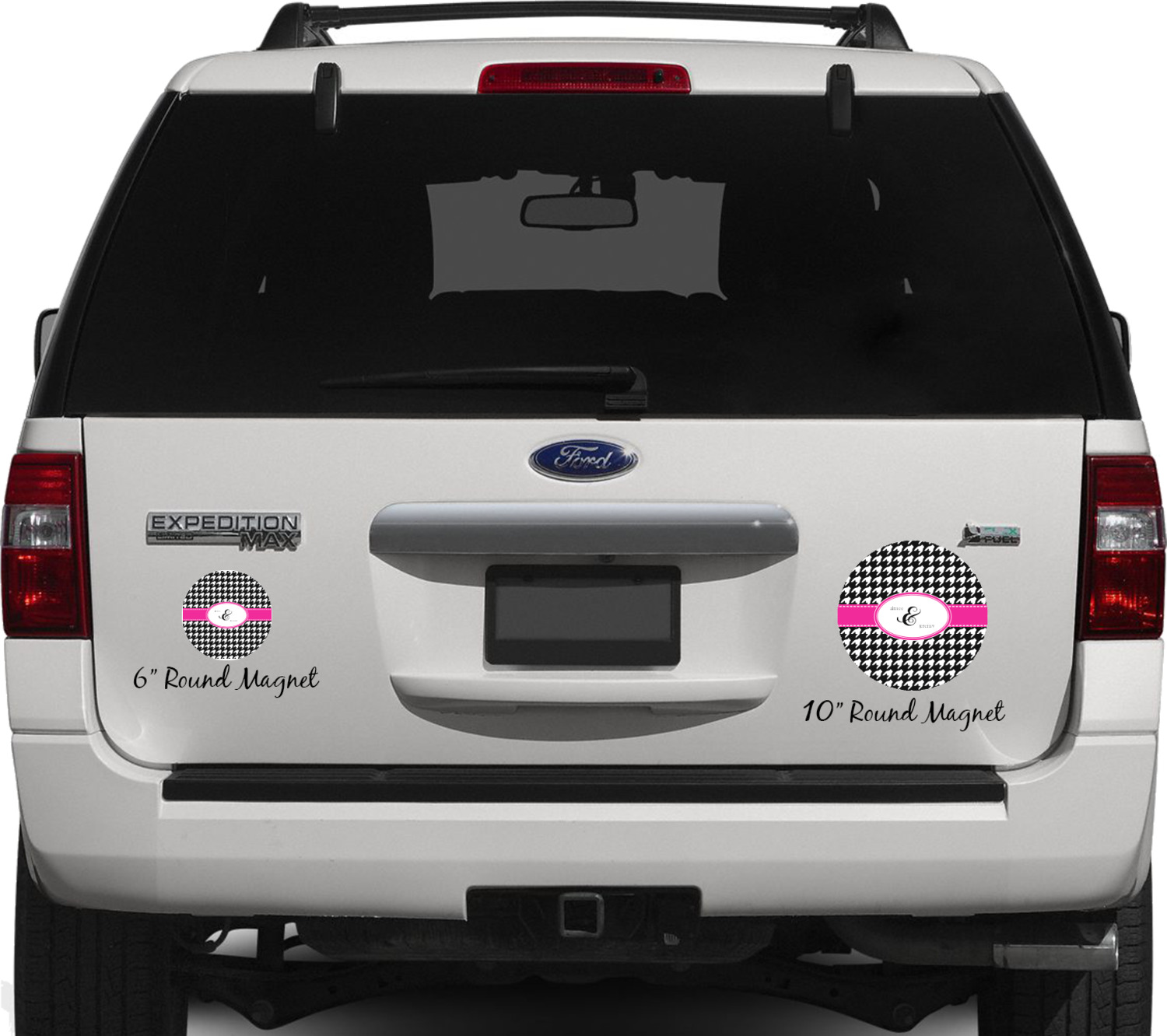 Your personalized car magnets are available for purchase in two shapes and two sizes. We carry round and square editions; each shape can either be 6 by 6 inches, or 10 by 10 inches, depending on your needs. Both versions are 1 millimeter thick, which is considered, within the industry, as the ideal thickness for automobile magnets. The magnetic car decals will adhere to any smooth, metal surface of your cars body, such as the trunk door or a side panel. However, please note that some vehicles are constructed from fiberglass bodies, which prevents the adhesion of anything magnetic. We advise that you test your vehicle before purchasing these magnets.