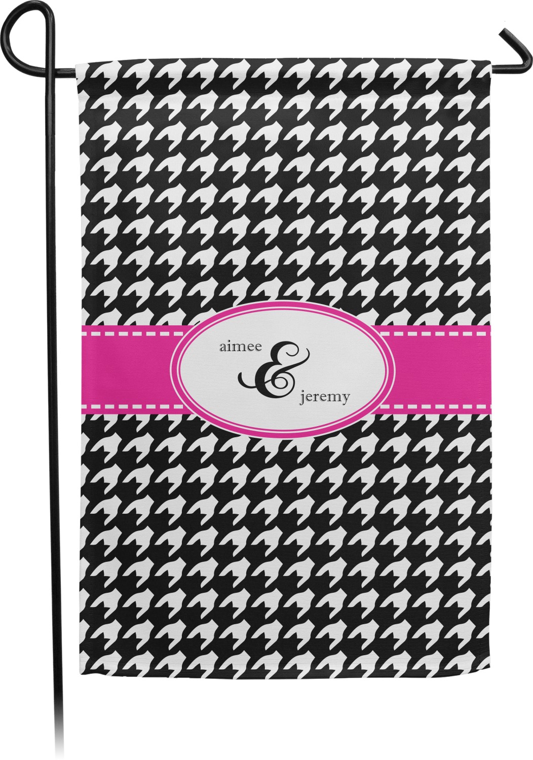 These custom garden flags are made of a durable, double-ply, polyester weave, allowing them to withstand the elements year round. The small flags measure at approximately 12 by 18 inches. The large flags measure out to 28 by 37 inches. You can order these decorative flags with your customization printed on the front only, or the front and back.