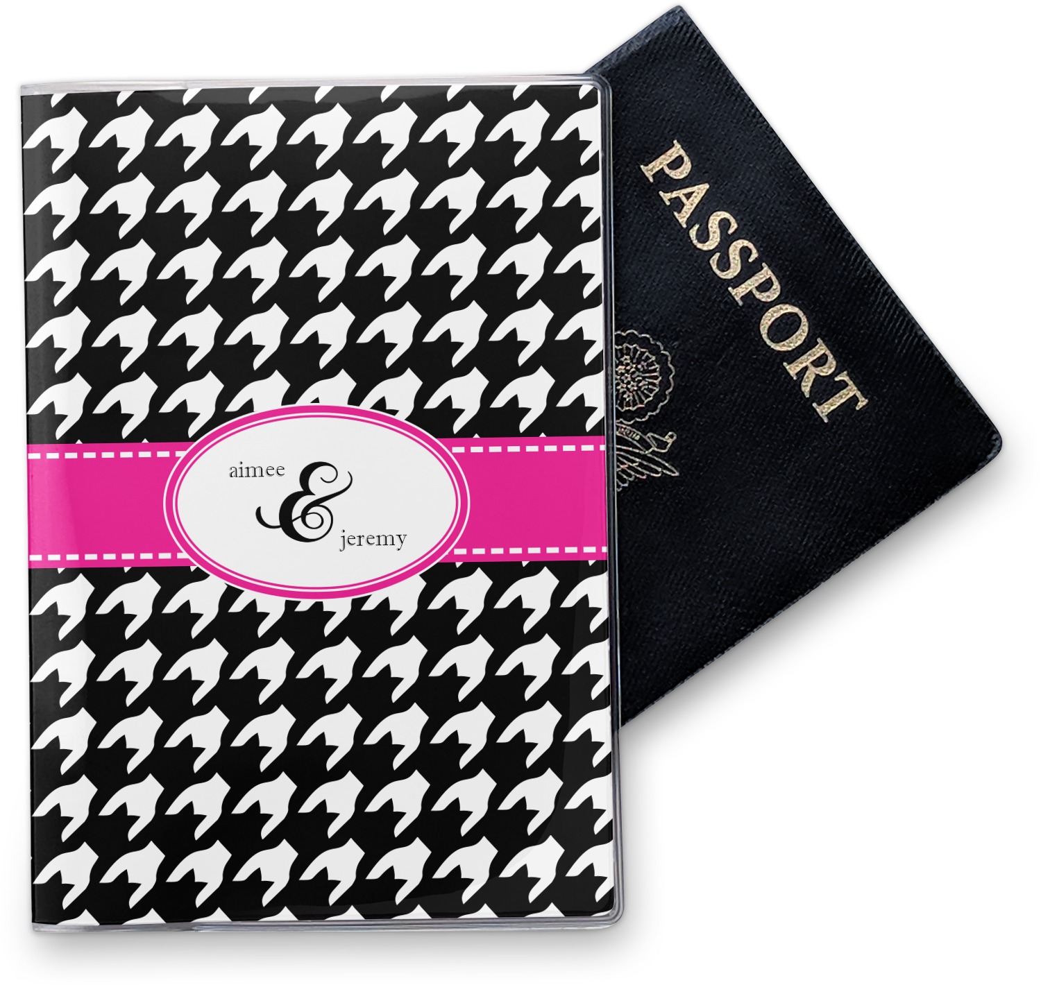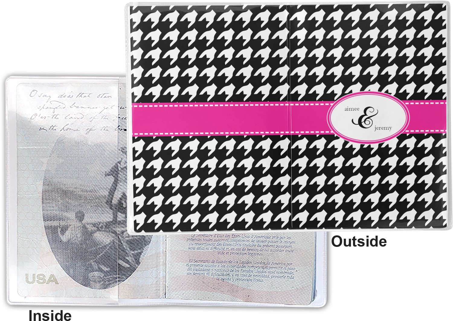 This cover is made of a sturdy clear vinyl with a personalized vinyl insert inside. There is a large and a small pocket on either side to hold the covers of your passport easily and firmly. The passport holder is approximately 7.5" x 5.25", the perfect size to snugly fit your passport. This slim cover is the perfect way to protect your passport without being one more bulky item you have to carry.