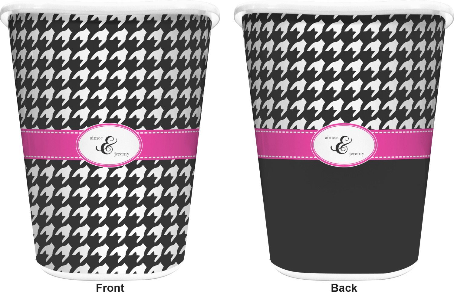 You can choose to purchase these decorative wastebaskets in either a white or a black color that will show on the base and the upper rim. Your customization is printed on a high-gloss, fine-quality vinyl adhesive, and you can choose to either have this adhesive applied to one side only or to both sides. As such, this plastic wastebasket can be single-sided or double-sided, depending on your creative vision. Your customization is printed using durable inks, making the design waterproof and resistant to fading over time.