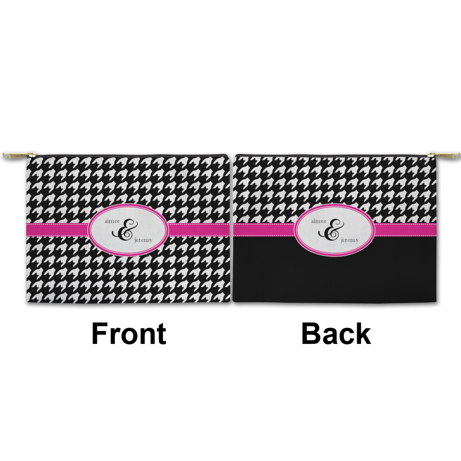 You can design both the front and the back of the pouch - same design, two complementary designs or two totally different designs - the choice is yours! We offer many different personalization styles i.e. name, name & initial, monograms - so the choice to personalize is also yours.