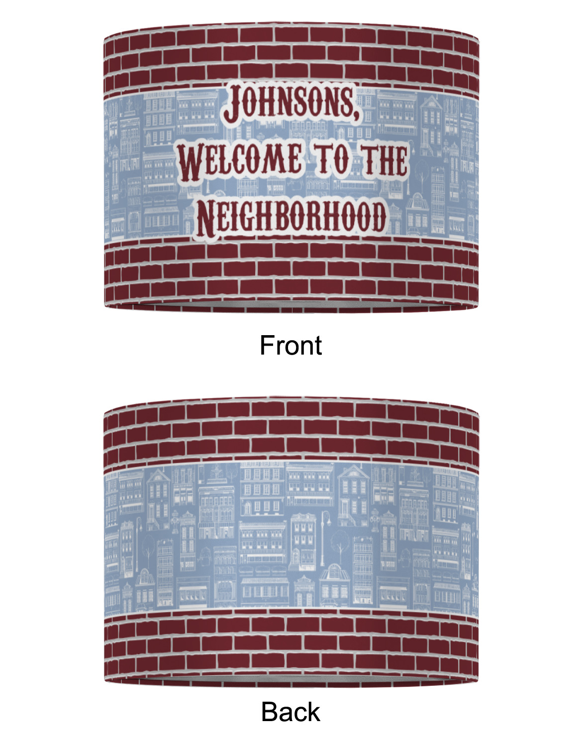 The design has two patterns with one surrounding the other in a square format. The inner pattern is a beautiful light-blue with white illustrations of houses and apartments. The outer design is a warm red brick pattern. The combination of these two patterns makes for a very friendly feeling design. The personalization goes directly in the middle of the inner design. The coordinating pattern has a fun colored graphic of a block of apartments and a place for text underneath.