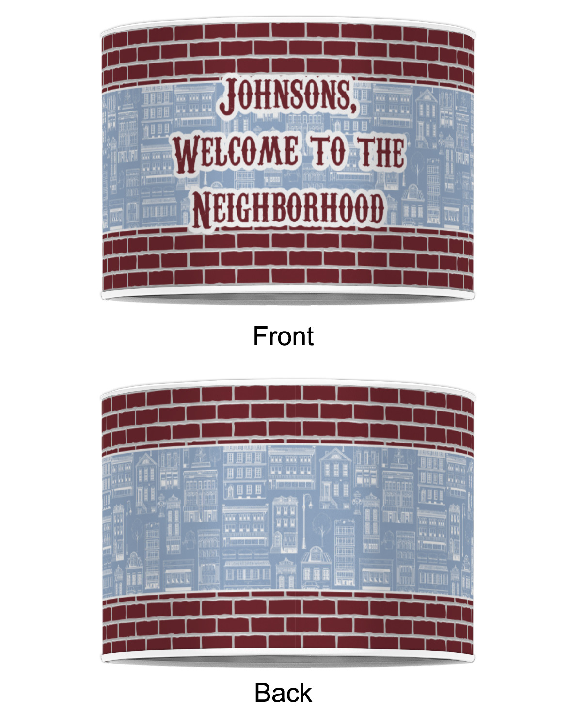 The design has two patterns with one surrounding the other in a square format. The inner pattern is a beautiful light-blue with white illustrations of houses and apartments. The outer design is a warm red brick pattern. The combination of these two patterns makes for a very friendly feeling design. The personalization goes directly in the middle of the inner design. The coordinating pattern has a fun colored graphic of a block of apartments and a place for text underneath.