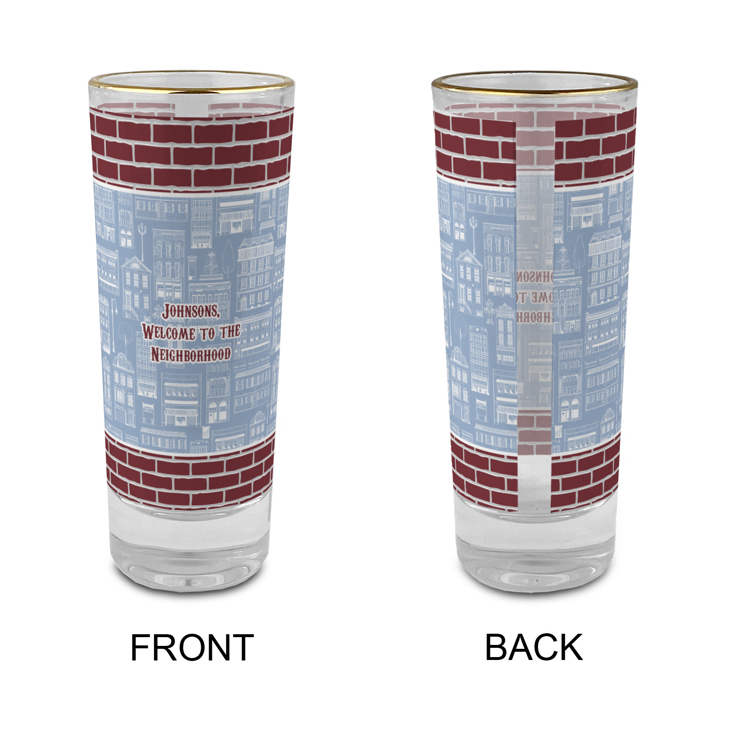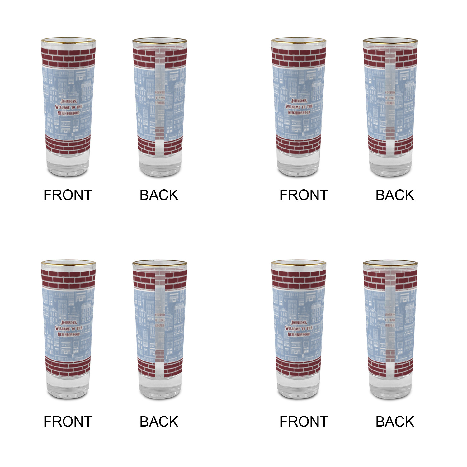 These glass shooter glasses are printed in full color with the design of your choice. These are a tall shooter 2 oz size and stand 4" tall. The print is a full wrap design to boldly display your personalization.