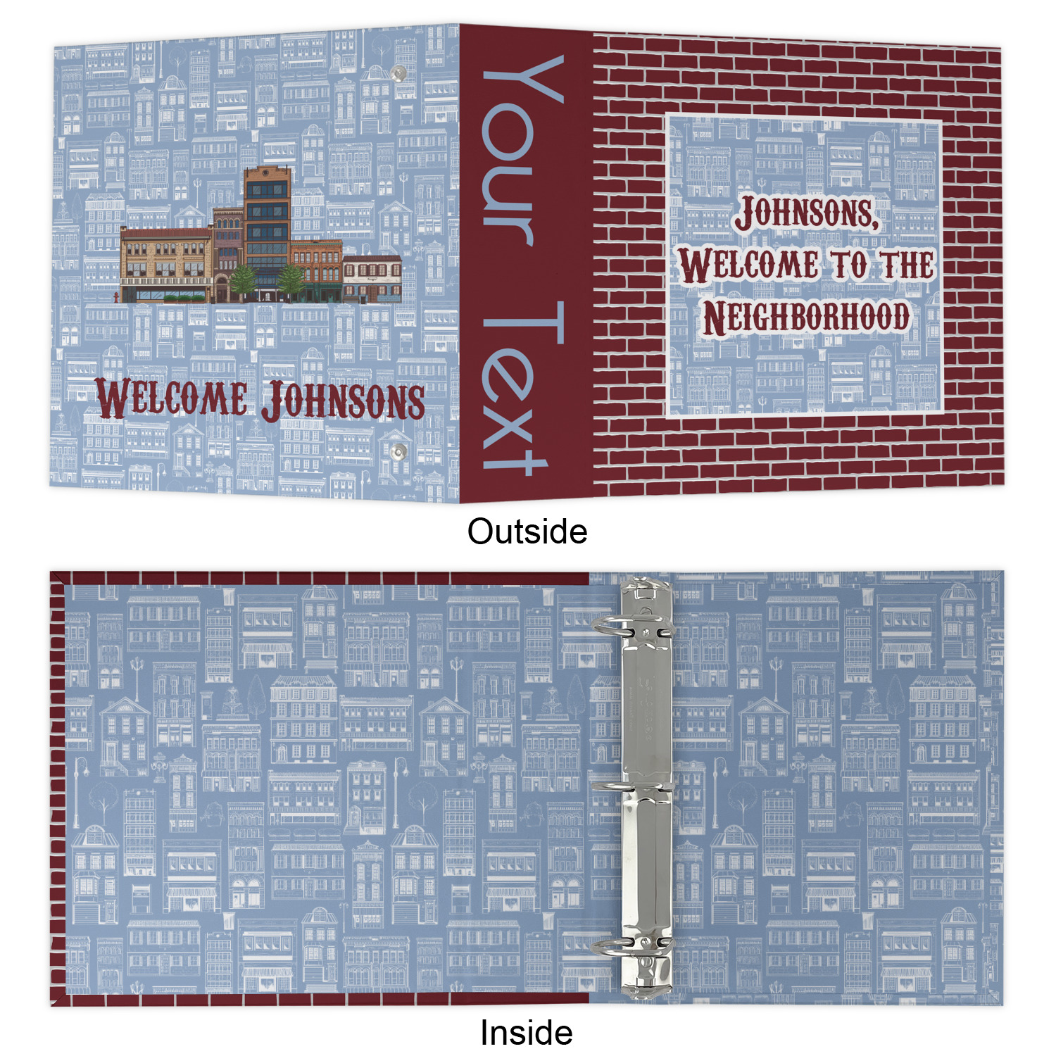 The design has two patterns with one surrounding the other in a square format. The inner pattern is a beautiful light-blue with white illustrations of houses and apartments. The outer design is a warm red brick pattern. The combination of these two patterns makes for a very friendly feeling design. The personalization goes directly in the middle of the inner design. The coordinating pattern has a fun colored graphic of a block of apartments and a place for text underneath.