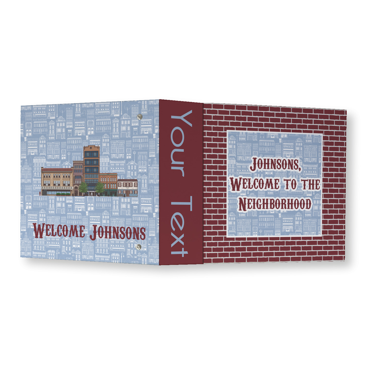 The design has two patterns with one surrounding the other in a square format. The inner pattern is a beautiful light-blue with white illustrations of houses and apartments. The outer design is a warm red brick pattern. The combination of these two patterns makes for a very friendly feeling design. The personalization goes directly in the middle of the inner design. The coordinating pattern has a fun colored graphic of a block of apartments and a place for text underneath.