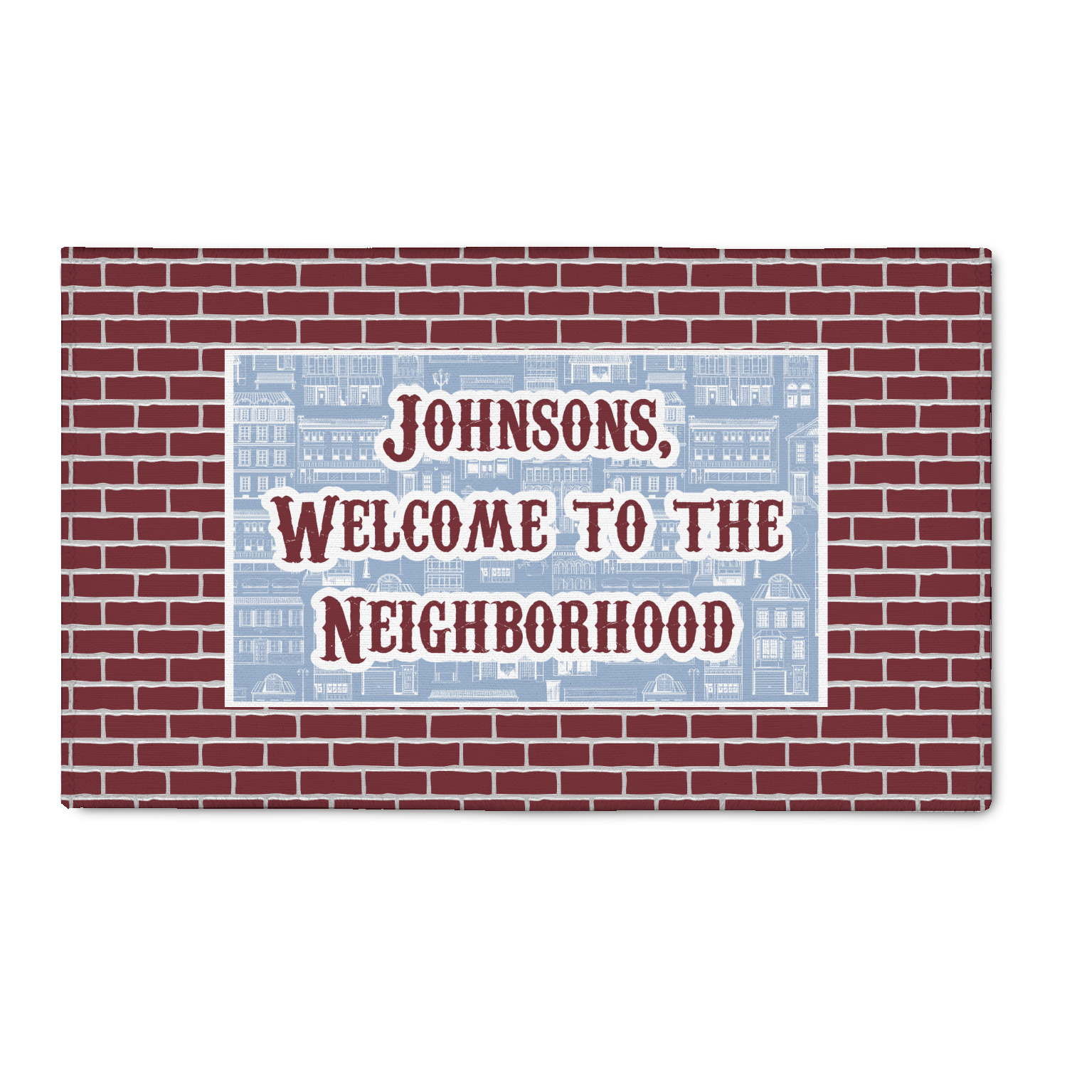 The design has two patterns with one surrounding the other in a square format. The inner pattern is a beautiful light-blue with white illustrations of houses and apartments. The outer design is a warm red brick pattern. The combination of these two patterns makes for a very friendly feeling design. The personalization goes directly in the middle of the inner design. The coordinating pattern has a fun colored graphic of a block of apartments and a place for text underneath.