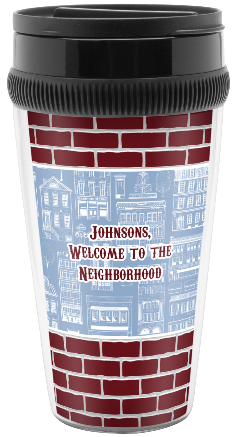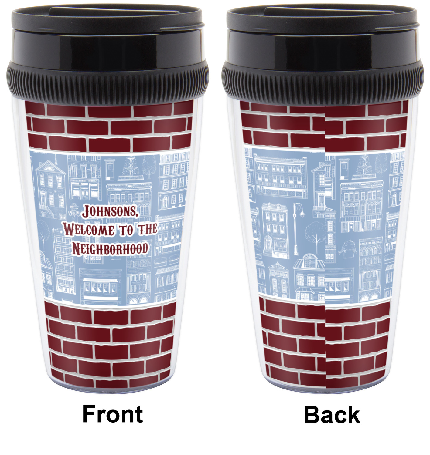The design has two patterns with one surrounding the other in a square format. The inner pattern is a beautiful light-blue with white illustrations of houses and apartments. The outer design is a warm red brick pattern. The combination of these two patterns makes for a very friendly feeling design. The personalization goes directly in the middle of the inner design. The coordinating pattern has a fun colored graphic of a block of apartments and a place for text underneath.