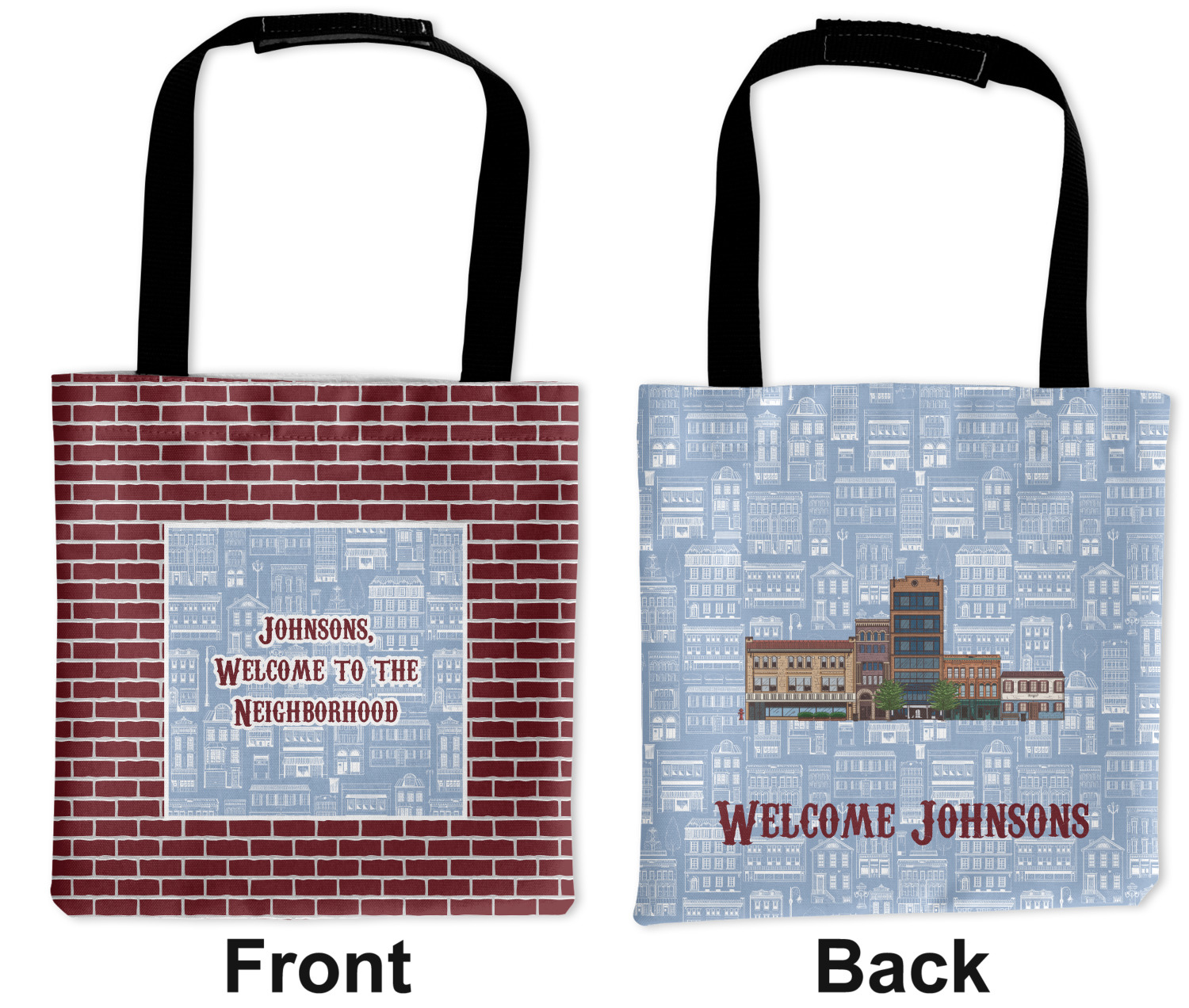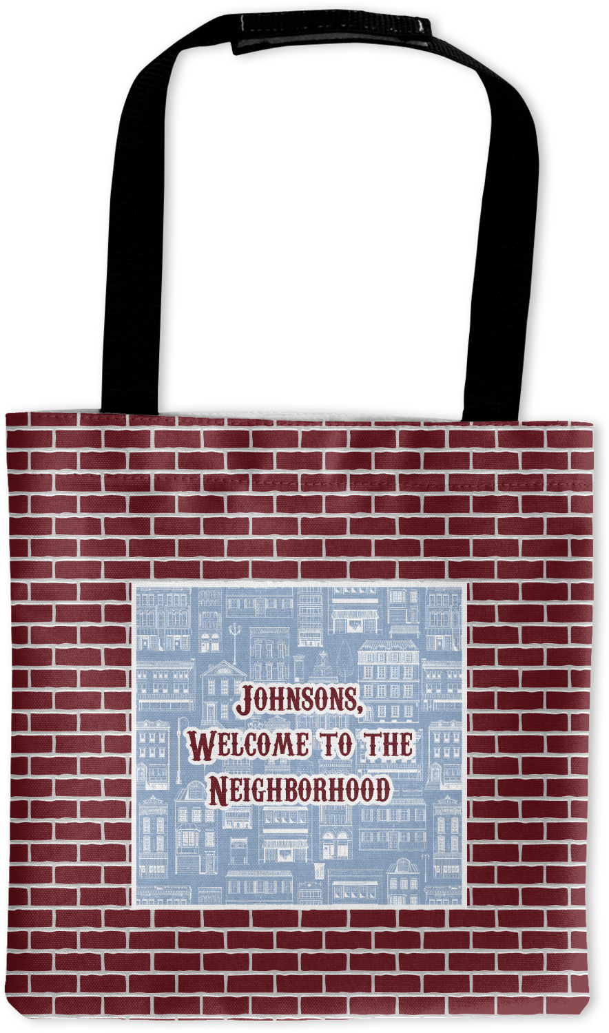 The design has two patterns with one surrounding the other in a square format. The inner pattern is a beautiful light-blue with white illustrations of houses and apartments. The outer design is a warm red brick pattern. The combination of these two patterns makes for a very friendly feeling design. The personalization goes directly in the middle of the inner design. The coordinating pattern has a fun colored graphic of a block of apartments and a place for text underneath.