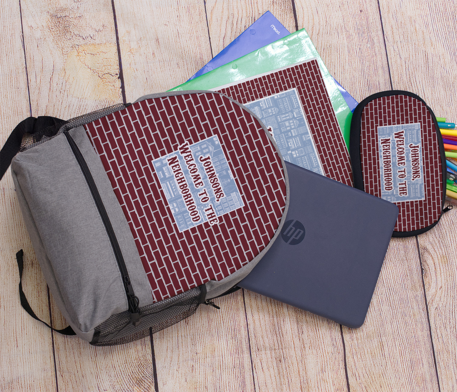 The design has two patterns with one surrounding the other in a square format. The inner pattern is a beautiful light-blue with white illustrations of houses and apartments. The outer design is a warm red brick pattern. The combination of these two patterns makes for a very friendly feeling design. The personalization goes directly in the middle of the inner design. The coordinating pattern has a fun colored graphic of a block of apartments and a place for text underneath.