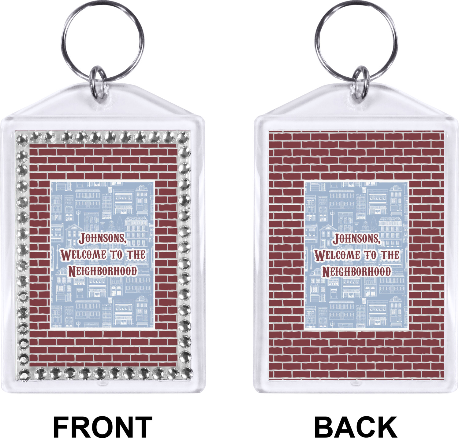 Our personalized keychains have a bold, rectangular shape, outlined by a series of shimmering rhinestones. A metal, split keyring is included with your purchase, and an additional metal hoop allows for attachment of the keychain to the split ring. This unique keychain measures at about 3.75 by 2.5 inches. We print your customized design(s) across both the back and front of this keychain.