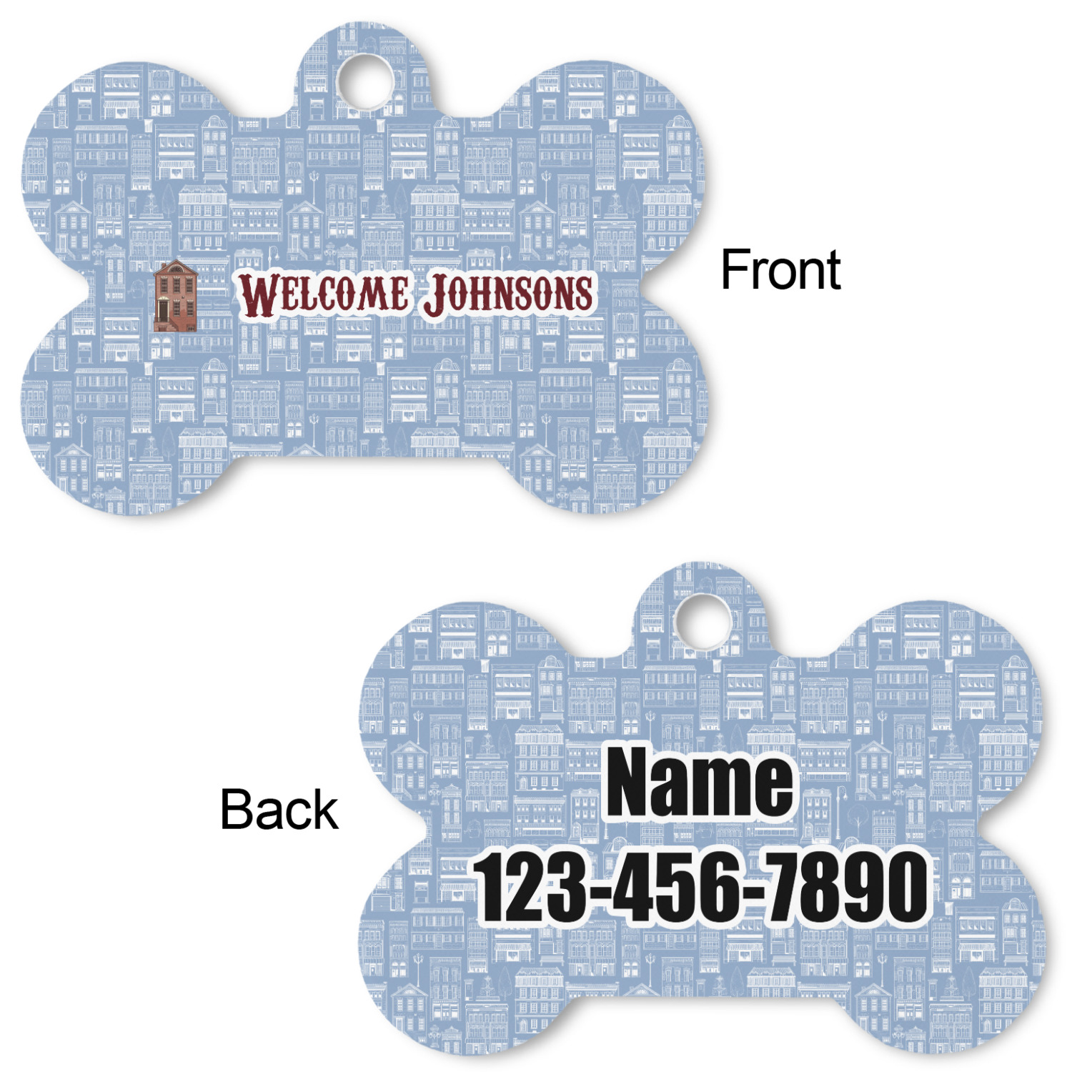 Our default design templates print your dog's personalization on the front and your contact information on the back; however everything is customizable, so you customize the patterns, the colors, the personalization, the contact information etc.