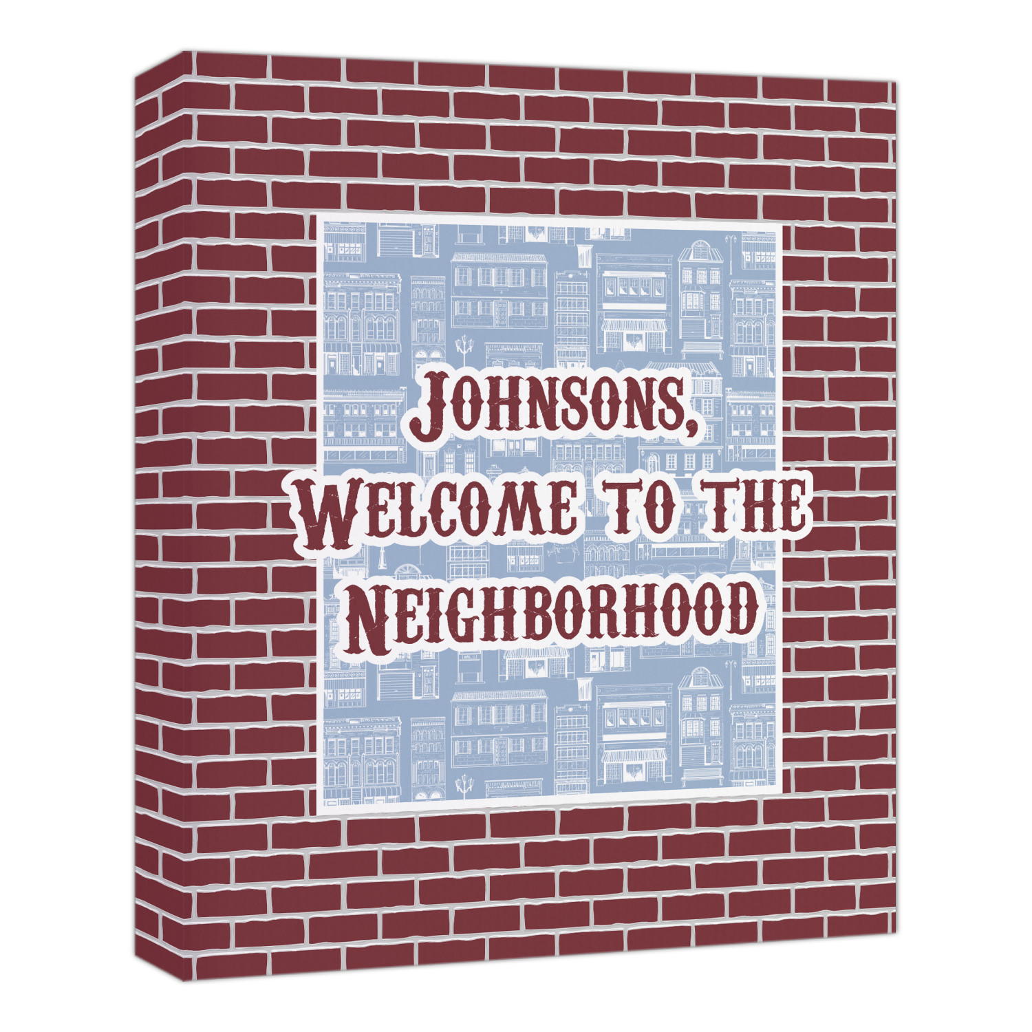 The design has two patterns with one surrounding the other in a square format. The inner pattern is a beautiful light-blue with white illustrations of houses and apartments. The outer design is a warm red brick pattern. The combination of these two patterns makes for a very friendly feeling design. The personalization goes directly in the middle of the inner design. The coordinating pattern has a fun colored graphic of a block of apartments and a place for text underneath.