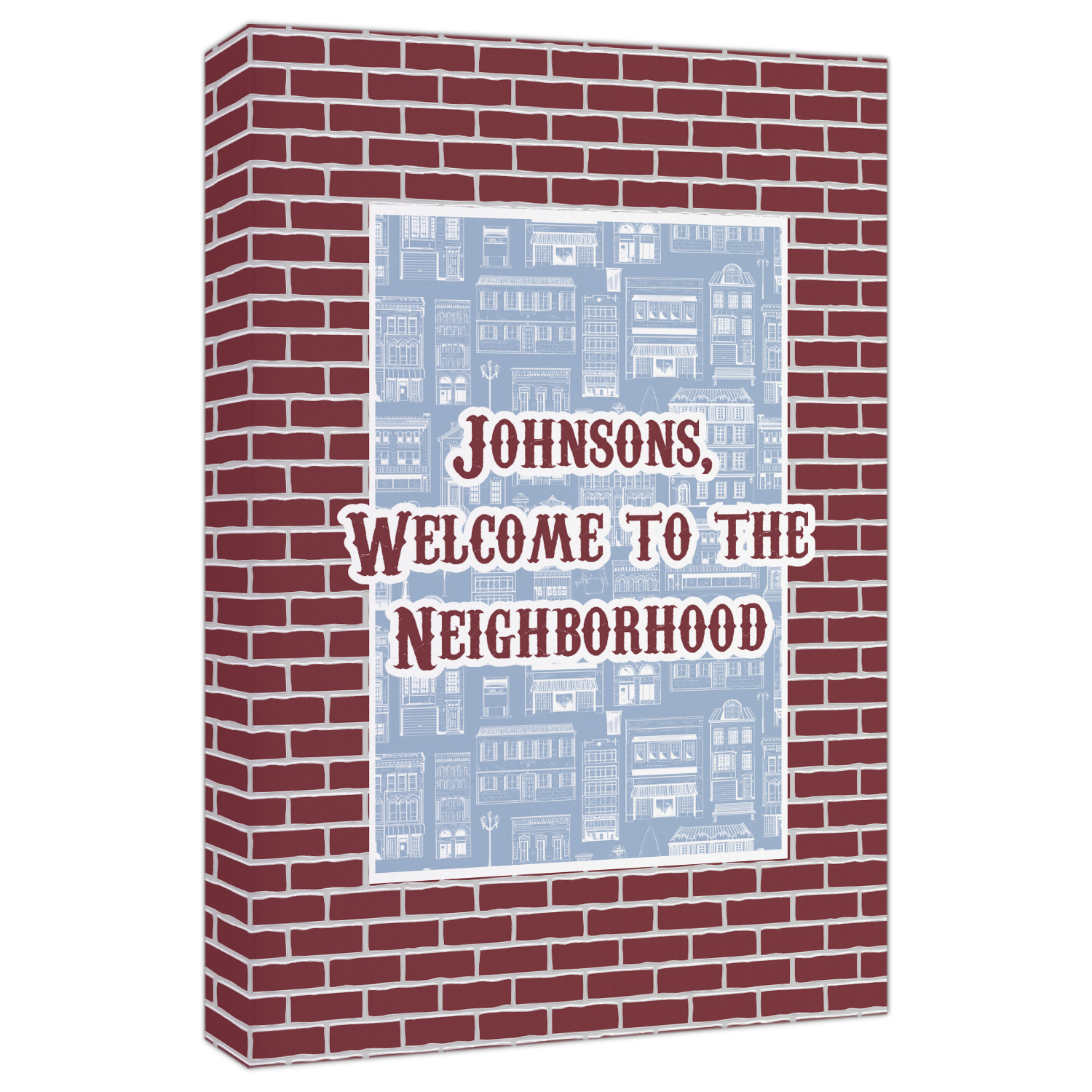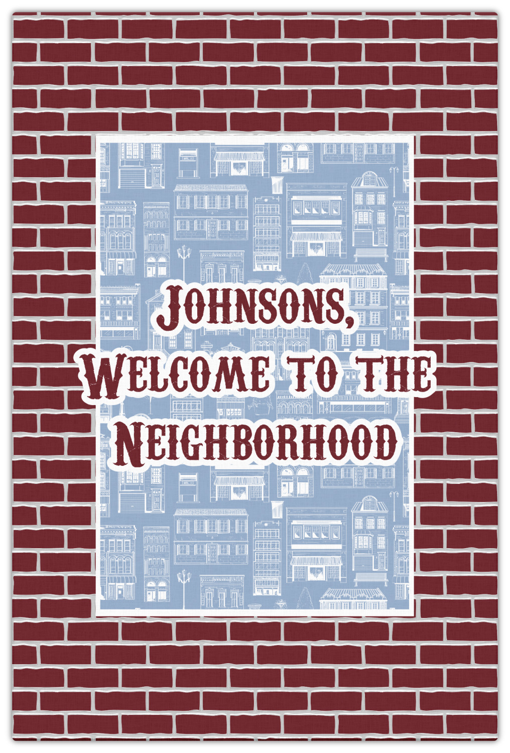 The design has two patterns with one surrounding the other in a square format. The inner pattern is a beautiful light-blue with white illustrations of houses and apartments. The outer design is a warm red brick pattern. The combination of these two patterns makes for a very friendly feeling design. The personalization goes directly in the middle of the inner design. The coordinating pattern has a fun colored graphic of a block of apartments and a place for text underneath.