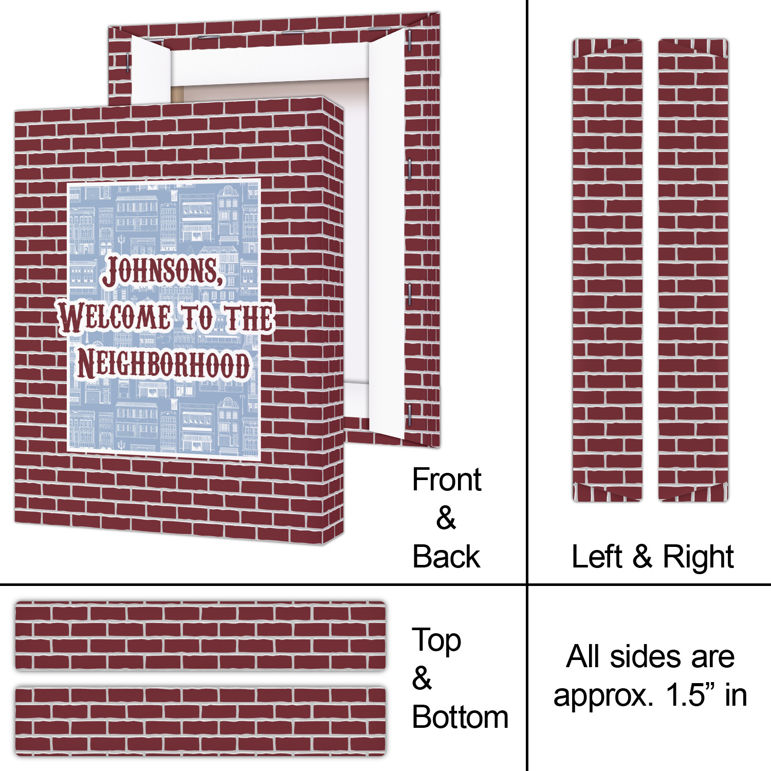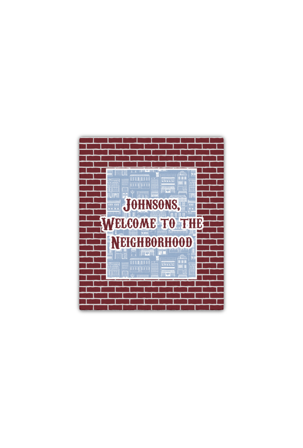 The design has two patterns with one surrounding the other in a square format. The inner pattern is a beautiful light-blue with white illustrations of houses and apartments. The outer design is a warm red brick pattern. The combination of these two patterns makes for a very friendly feeling design. The personalization goes directly in the middle of the inner design. The coordinating pattern has a fun colored graphic of a block of apartments and a place for text underneath.