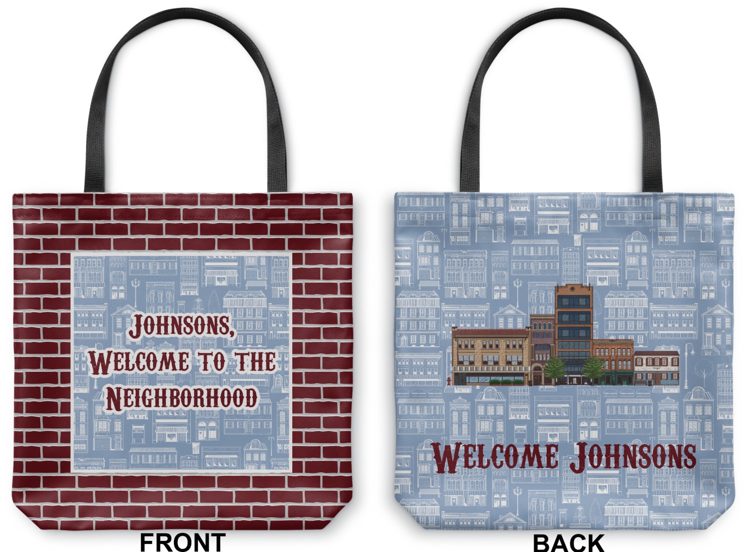 The design has two patterns with one surrounding the other in a square format. The inner pattern is a beautiful light-blue with white illustrations of houses and apartments. The outer design is a warm red brick pattern. The combination of these two patterns makes for a very friendly feeling design. The personalization goes directly in the middle of the inner design. The coordinating pattern has a fun colored graphic of a block of apartments and a place for text underneath.