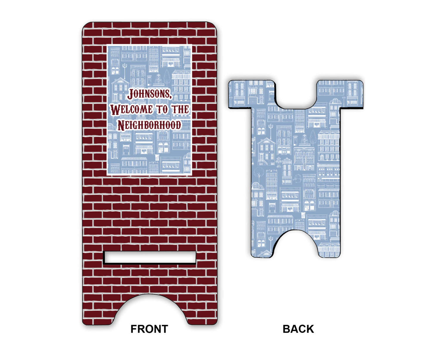 The design has two patterns with one surrounding the other in a square format. The inner pattern is a beautiful light-blue with white illustrations of houses and apartments. The outer design is a warm red brick pattern. The combination of these two patterns makes for a very friendly feeling design. The personalization goes directly in the middle of the inner design. The coordinating pattern has a fun colored graphic of a block of apartments and a place for text underneath.