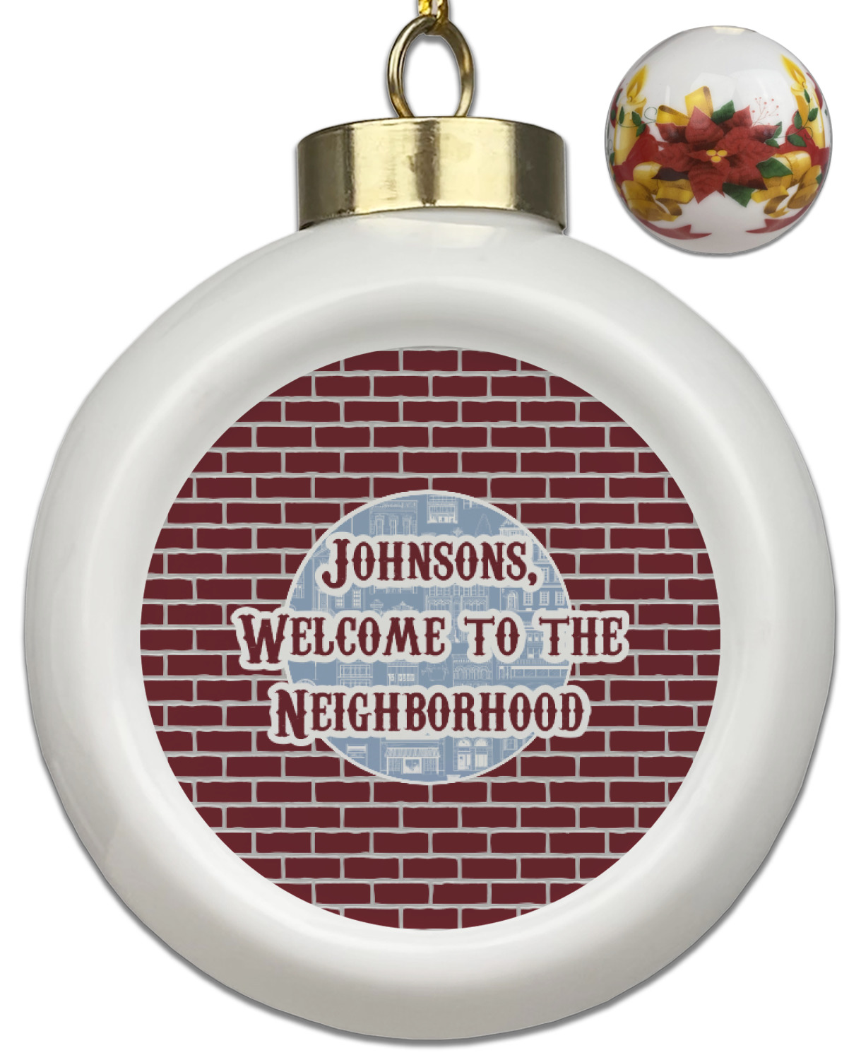 Our Christmas ornaments are a unique ceramic ball shape with a twist as it has a flat face to display your custom design! Select from one of our two design types - Christmas Tree or Poinsettia Garland - to adorn the curved back of your personal design. Each ornament measures 3H x 2.5W x 2D accompanied with a gold string accent for finishing touches to hang on your beautiful Christmas tree!
