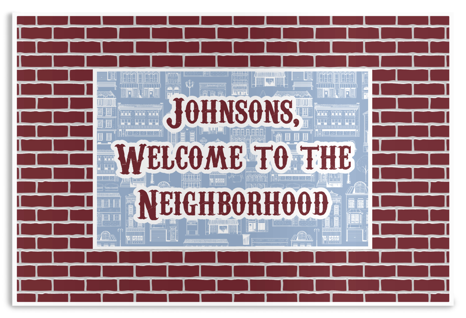 The design has two patterns with one surrounding the other in a square format. The inner pattern is a beautiful light-blue with white illustrations of houses and apartments. The outer design is a warm red brick pattern. The combination of these two patterns makes for a very friendly feeling design. The personalization goes directly in the middle of the inner design. The coordinating pattern has a fun colored graphic of a block of apartments and a place for text underneath.