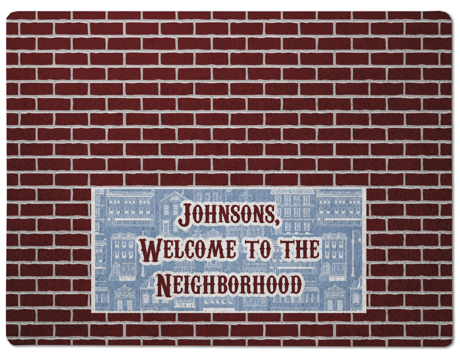The design has two patterns with one surrounding the other in a square format. The inner pattern is a beautiful light-blue with white illustrations of houses and apartments. The outer design is a warm red brick pattern. The combination of these two patterns makes for a very friendly feeling design. The personalization goes directly in the middle of the inner design. The coordinating pattern has a fun colored graphic of a block of apartments and a place for text underneath.