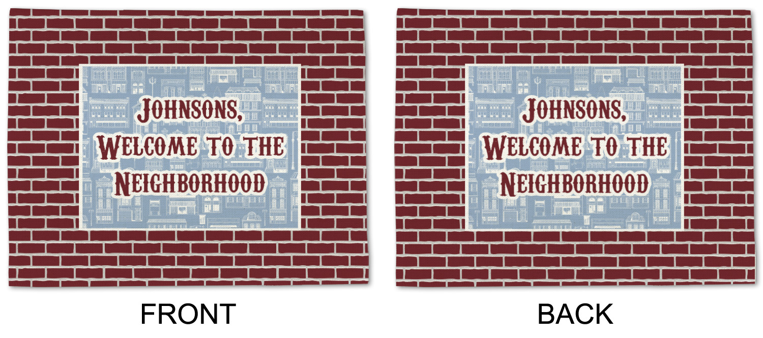The design has two patterns with one surrounding the other in a square format. The inner pattern is a beautiful light-blue with white illustrations of houses and apartments. The outer design is a warm red brick pattern. The combination of these two patterns makes for a very friendly feeling design. The personalization goes directly in the middle of the inner design. The coordinating pattern has a fun colored graphic of a block of apartments and a place for text underneath.
