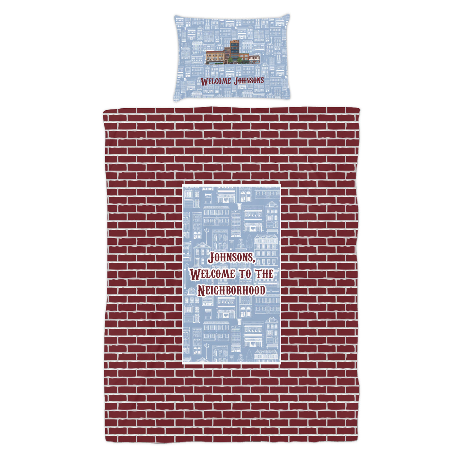 The design has two patterns with one surrounding the other in a square format. The inner pattern is a beautiful light-blue with white illustrations of houses and apartments. The outer design is a warm red brick pattern. The combination of these two patterns makes for a very friendly feeling design. The personalization goes directly in the middle of the inner design. The coordinating pattern has a fun colored graphic of a block of apartments and a place for text underneath.