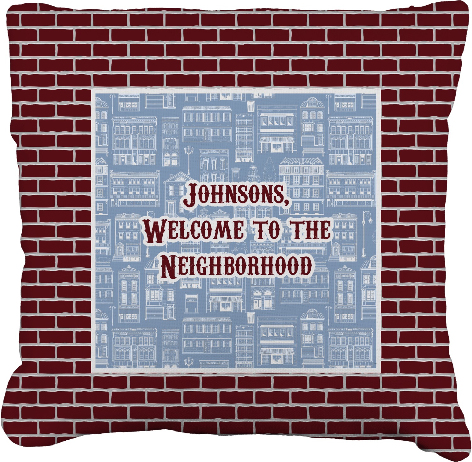 The design has two patterns with one surrounding the other in a square format. The inner pattern is a beautiful light-blue with white illustrations of houses and apartments. The outer design is a warm red brick pattern. The combination of these two patterns makes for a very friendly feeling design. The personalization goes directly in the middle of the inner design. The coordinating pattern has a fun colored graphic of a block of apartments and a place for text underneath.