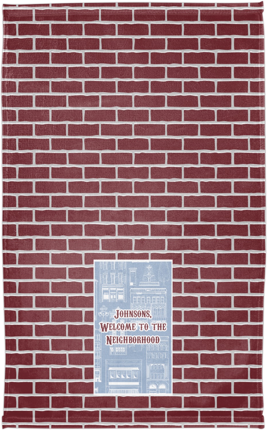 The design has two patterns with one surrounding the other in a square format. The inner pattern is a beautiful light-blue with white illustrations of houses and apartments. The outer design is a warm red brick pattern. The combination of these two patterns makes for a very friendly feeling design. The personalization goes directly in the middle of the inner design. The coordinating pattern has a fun colored graphic of a block of apartments and a place for text underneath.