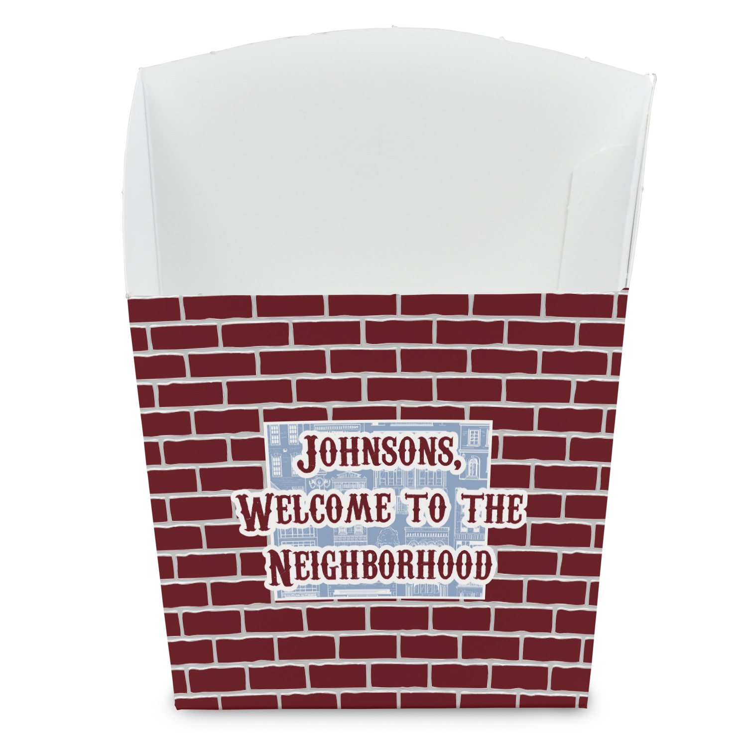 The design has two patterns with one surrounding the other in a square format. The inner pattern is a beautiful light-blue with white illustrations of houses and apartments. The outer design is a warm red brick pattern. The combination of these two patterns makes for a very friendly feeling design. The personalization goes directly in the middle of the inner design. The coordinating pattern has a fun colored graphic of a block of apartments and a place for text underneath.