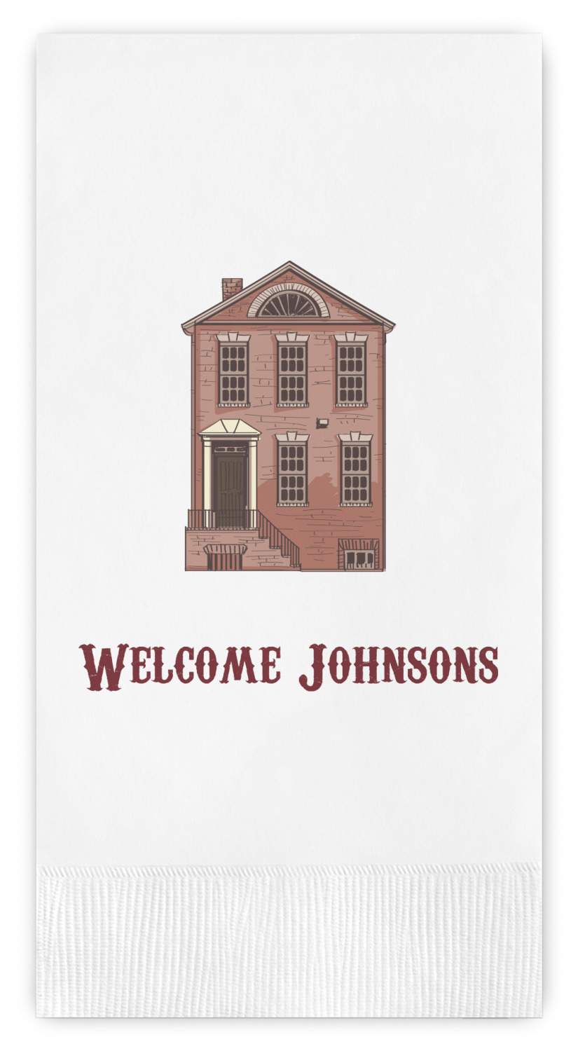 The design has two patterns with one surrounding the other in a square format. The inner pattern is a beautiful light-blue with white illustrations of houses and apartments. The outer design is a warm red brick pattern. The combination of these two patterns makes for a very friendly feeling design. The personalization goes directly in the middle of the inner design. The coordinating pattern has a fun colored graphic of a block of apartments and a place for text underneath.