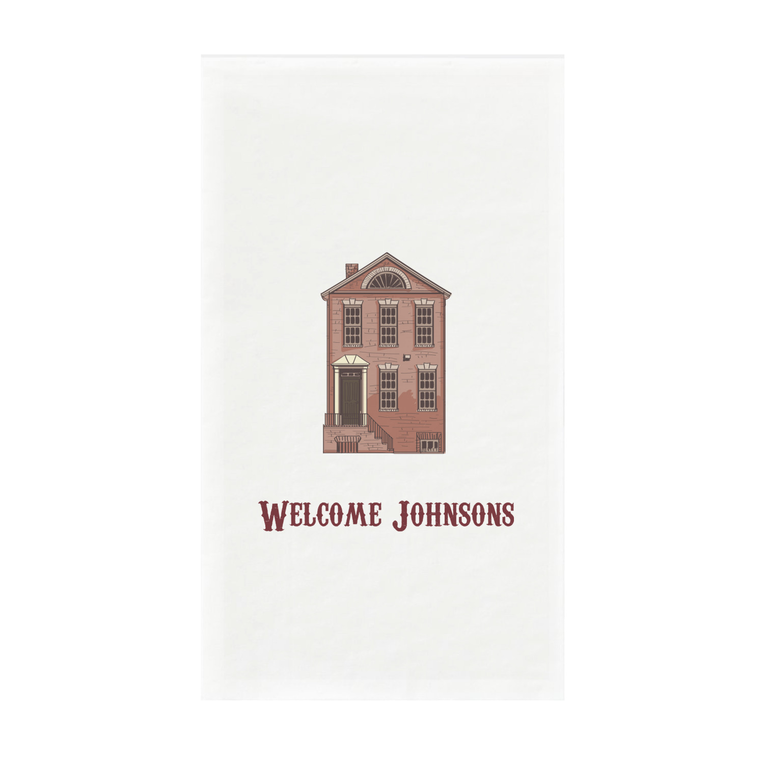 The design has two patterns with one surrounding the other in a square format. The inner pattern is a beautiful light-blue with white illustrations of houses and apartments. The outer design is a warm red brick pattern. The combination of these two patterns makes for a very friendly feeling design. The personalization goes directly in the middle of the inner design. The coordinating pattern has a fun colored graphic of a block of apartments and a place for text underneath.
