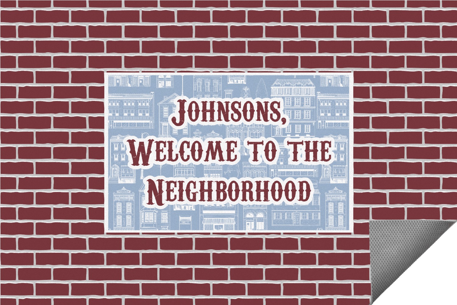 The design has two patterns with one surrounding the other in a square format. The inner pattern is a beautiful light-blue with white illustrations of houses and apartments. The outer design is a warm red brick pattern. The combination of these two patterns makes for a very friendly feeling design. The personalization goes directly in the middle of the inner design. The coordinating pattern has a fun colored graphic of a block of apartments and a place for text underneath.
