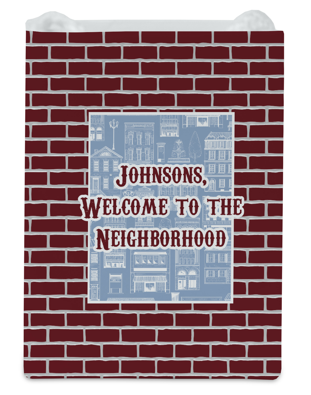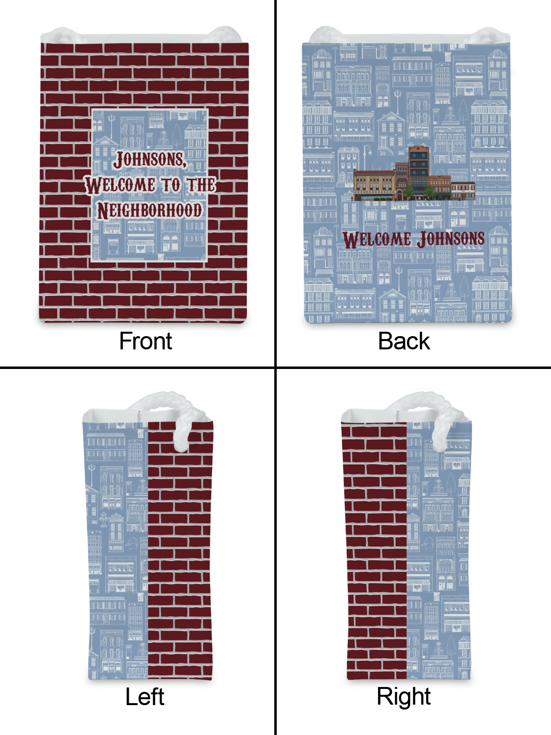 The design has two patterns with one surrounding the other in a square format. The inner pattern is a beautiful light-blue with white illustrations of houses and apartments. The outer design is a warm red brick pattern. The combination of these two patterns makes for a very friendly feeling design. The personalization goes directly in the middle of the inner design. The coordinating pattern has a fun colored graphic of a block of apartments and a place for text underneath.
