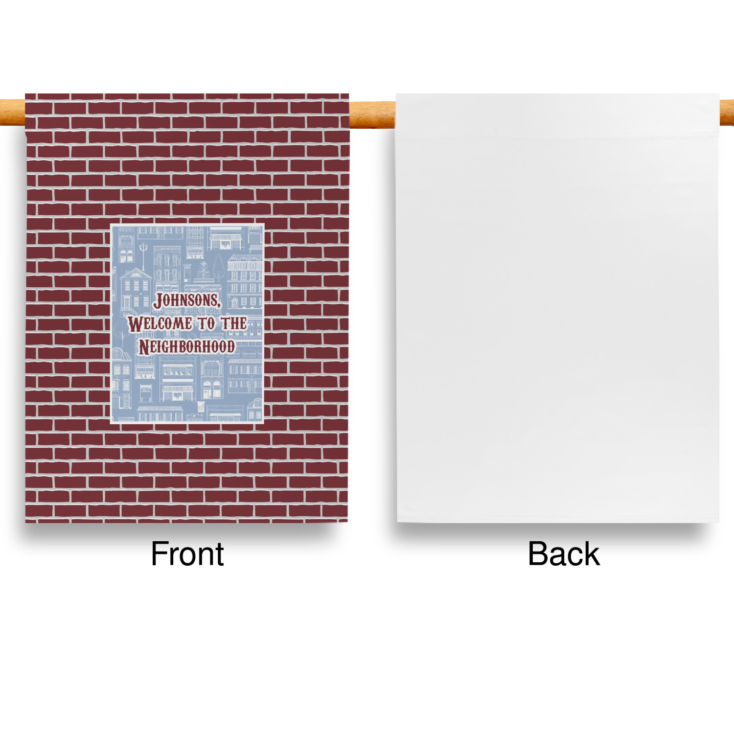 These custom garden flags are made of a durable, double-ply, polyester weave, allowing them to withstand the elements year round. The small flags measure at approximately 12 by 18 inches. The large flags measure out to 28 by 37 inches. You can order these decorative flags with your customization printed on the front only, or the front and back.