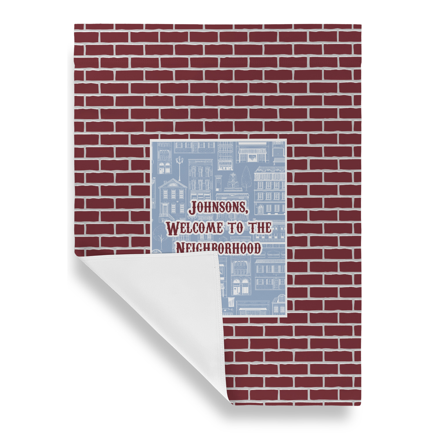 The design has two patterns with one surrounding the other in a square format. The inner pattern is a beautiful light-blue with white illustrations of houses and apartments. The outer design is a warm red brick pattern. The combination of these two patterns makes for a very friendly feeling design. The personalization goes directly in the middle of the inner design. The coordinating pattern has a fun colored graphic of a block of apartments and a place for text underneath.