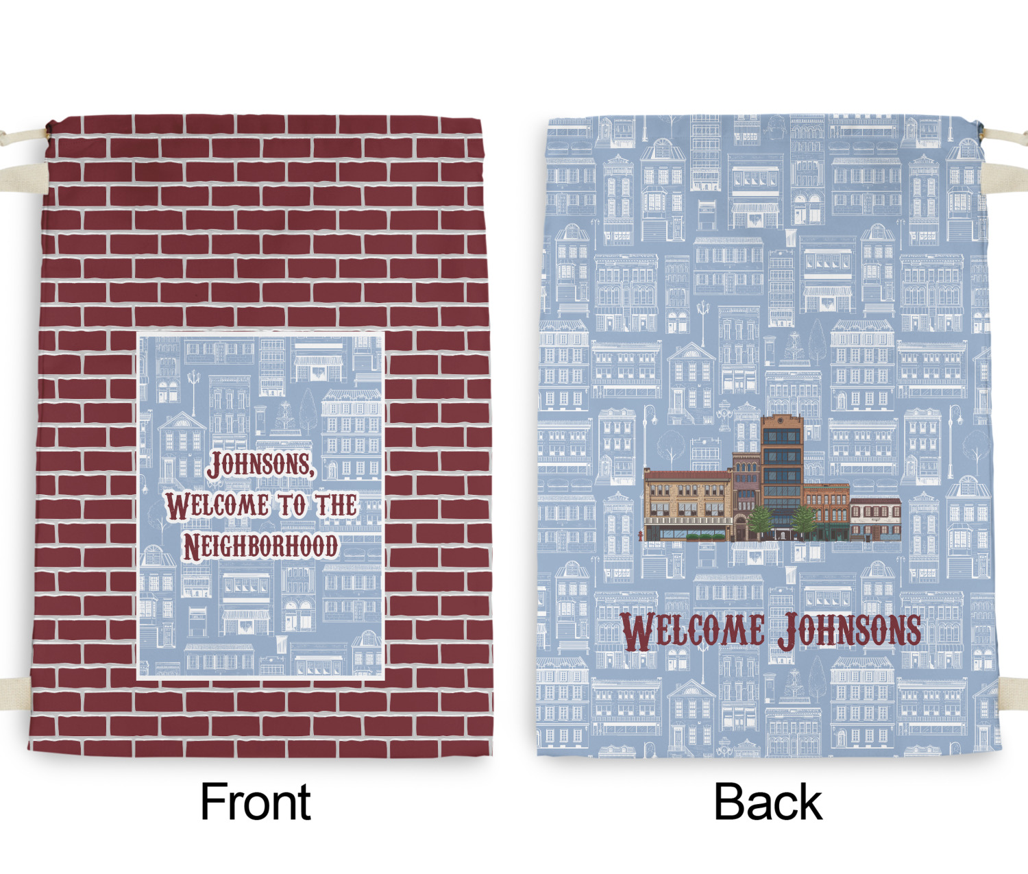 The design has two patterns with one surrounding the other in a square format. The inner pattern is a beautiful light-blue with white illustrations of houses and apartments. The outer design is a warm red brick pattern. The combination of these two patterns makes for a very friendly feeling design. The personalization goes directly in the middle of the inner design. The coordinating pattern has a fun colored graphic of a block of apartments and a place for text underneath.