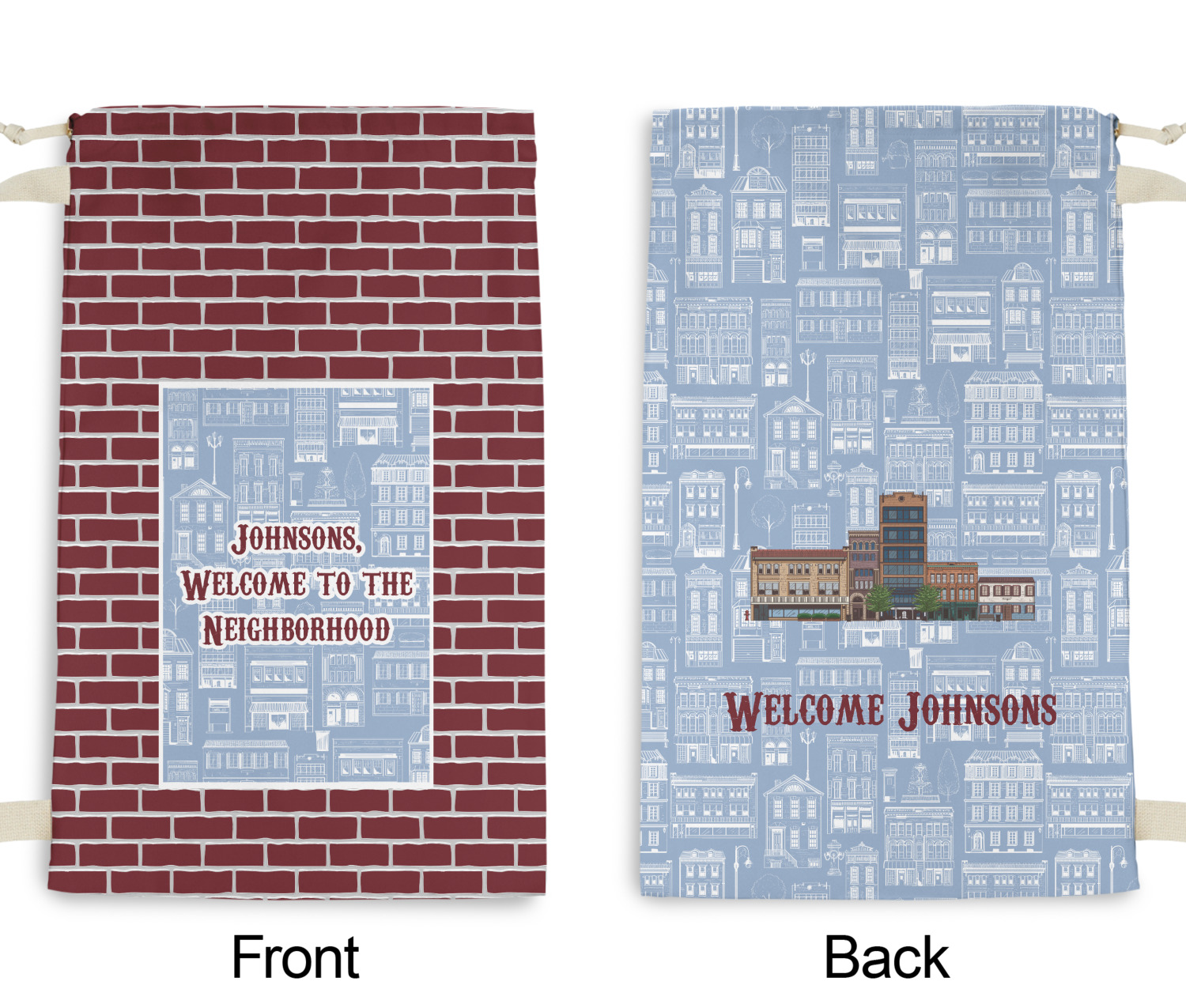 The design has two patterns with one surrounding the other in a square format. The inner pattern is a beautiful light-blue with white illustrations of houses and apartments. The outer design is a warm red brick pattern. The combination of these two patterns makes for a very friendly feeling design. The personalization goes directly in the middle of the inner design. The coordinating pattern has a fun colored graphic of a block of apartments and a place for text underneath.