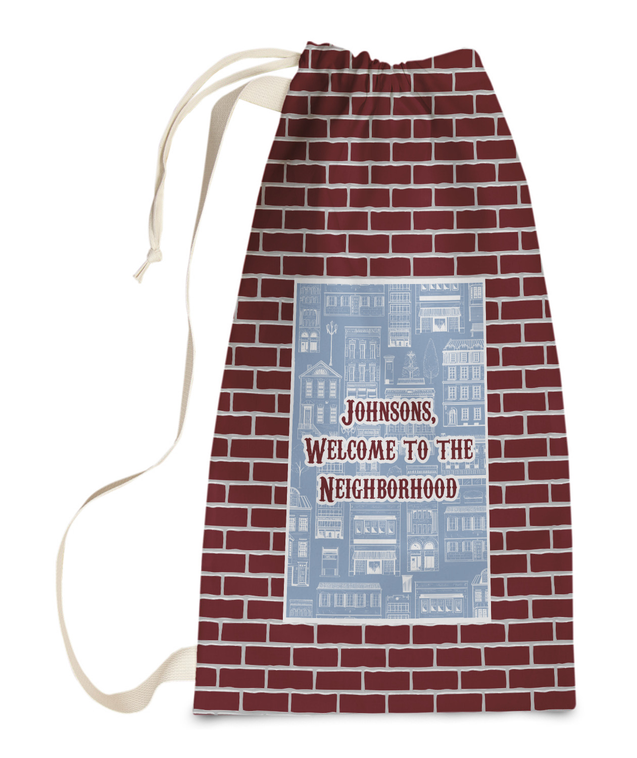 Carry your laundry in style with these customized laundry bags. Available in two sizes, featuring a natural colored woven strap and a cinch cord, these bags hold a lot of clothes or anything else you want to fit in them.