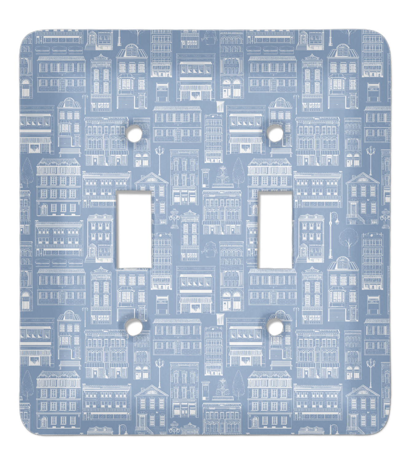 The design has two patterns with one surrounding the other in a square format. The inner pattern is a beautiful light-blue with white illustrations of houses and apartments. The outer design is a warm red brick pattern. The combination of these two patterns makes for a very friendly feeling design. The personalization goes directly in the middle of the inner design. The coordinating pattern has a fun colored graphic of a block of apartments and a place for text underneath.