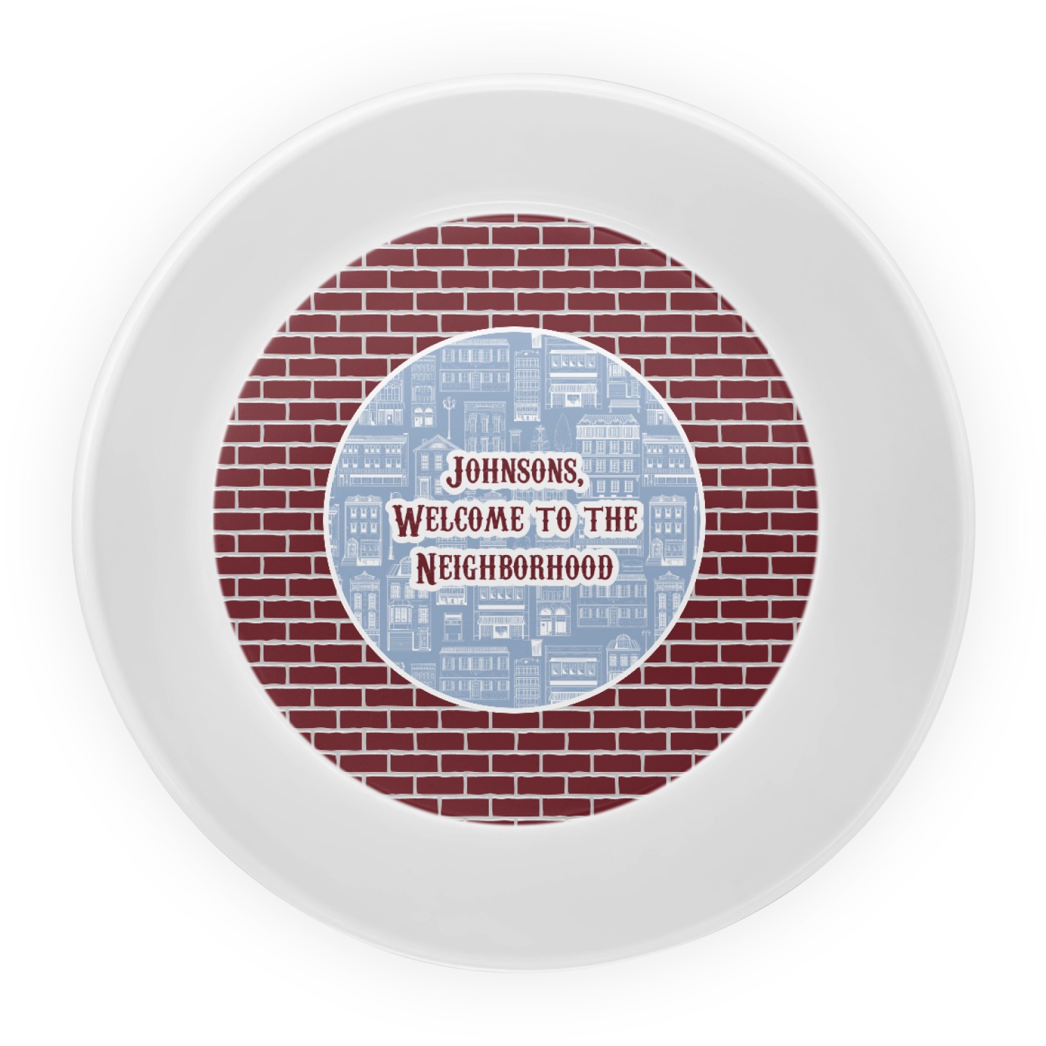 The design has two patterns with one surrounding the other in a square format. The inner pattern is a beautiful light-blue with white illustrations of houses and apartments. The outer design is a warm red brick pattern. The combination of these two patterns makes for a very friendly feeling design. The personalization goes directly in the middle of the inner design. The coordinating pattern has a fun colored graphic of a block of apartments and a place for text underneath.
