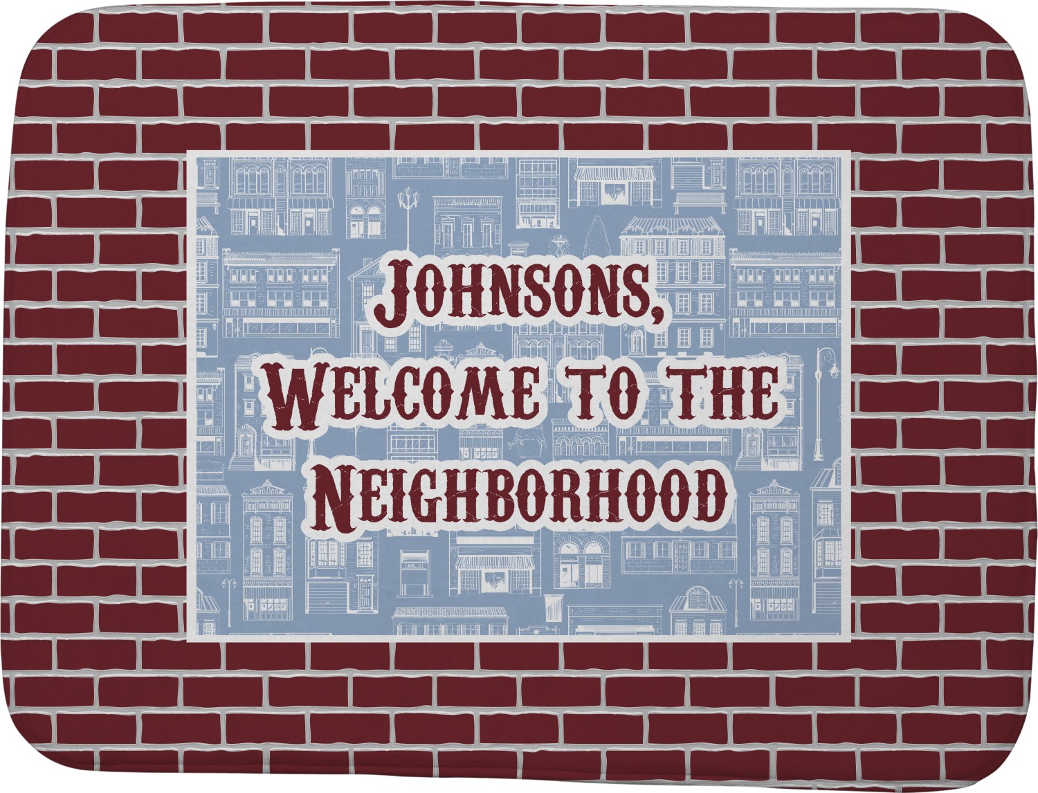 The design has two patterns with one surrounding the other in a square format. The inner pattern is a beautiful light-blue with white illustrations of houses and apartments. The outer design is a warm red brick pattern. The combination of these two patterns makes for a very friendly feeling design. The personalization goes directly in the middle of the inner design. The coordinating pattern has a fun colored graphic of a block of apartments and a place for text underneath.