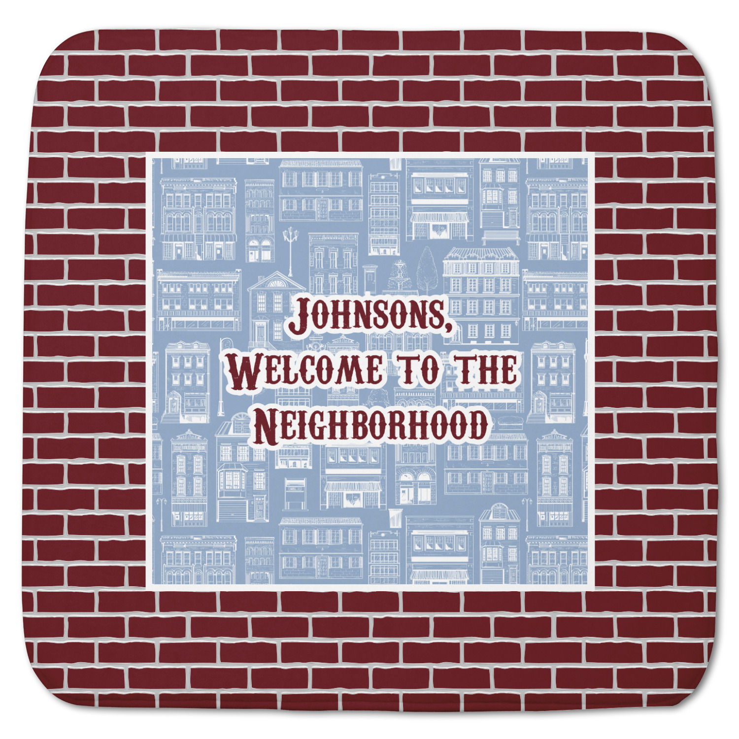 The design has two patterns with one surrounding the other in a square format. The inner pattern is a beautiful light-blue with white illustrations of houses and apartments. The outer design is a warm red brick pattern. The combination of these two patterns makes for a very friendly feeling design. The personalization goes directly in the middle of the inner design. The coordinating pattern has a fun colored graphic of a block of apartments and a place for text underneath.