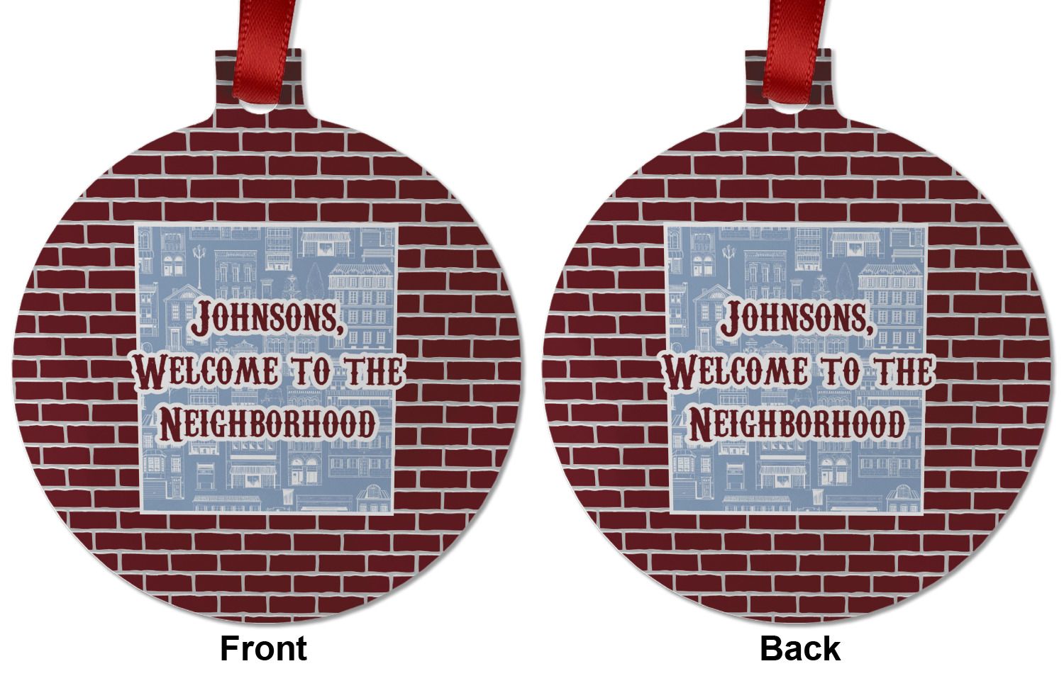 The design has two patterns with one surrounding the other in a square format. The inner pattern is a beautiful light-blue with white illustrations of houses and apartments. The outer design is a warm red brick pattern. The combination of these two patterns makes for a very friendly feeling design. The personalization goes directly in the middle of the inner design. The coordinating pattern has a fun colored graphic of a block of apartments and a place for text underneath.