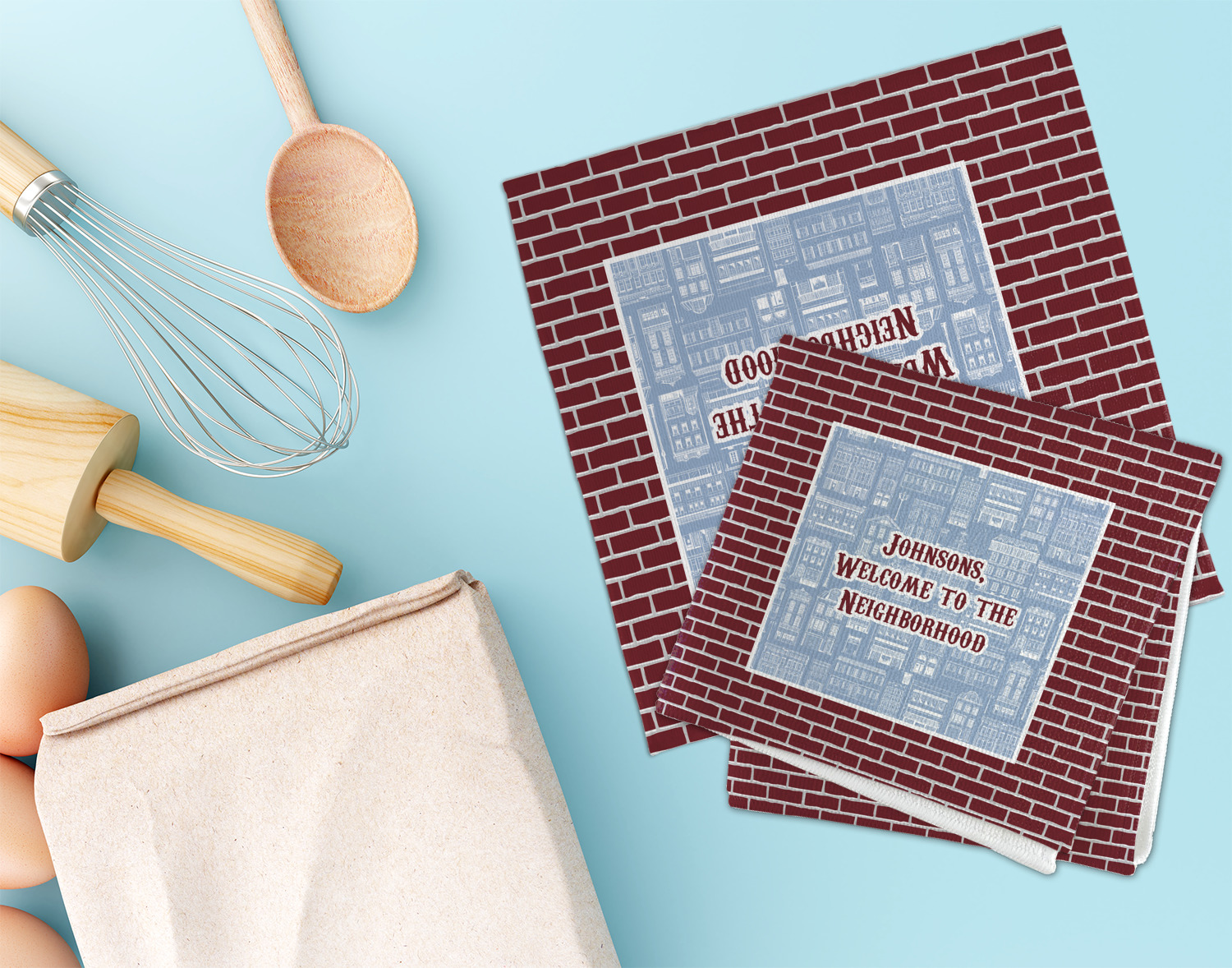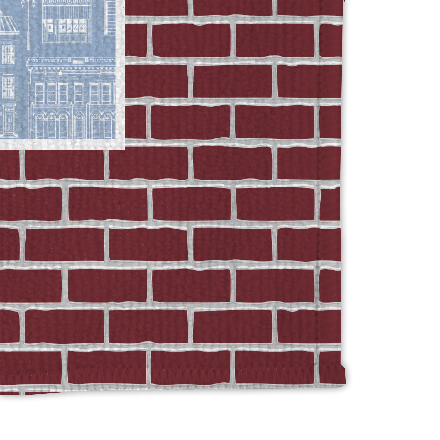The design has two patterns with one surrounding the other in a square format. The inner pattern is a beautiful light-blue with white illustrations of houses and apartments. The outer design is a warm red brick pattern. The combination of these two patterns makes for a very friendly feeling design. The personalization goes directly in the middle of the inner design. The coordinating pattern has a fun colored graphic of a block of apartments and a place for text underneath.