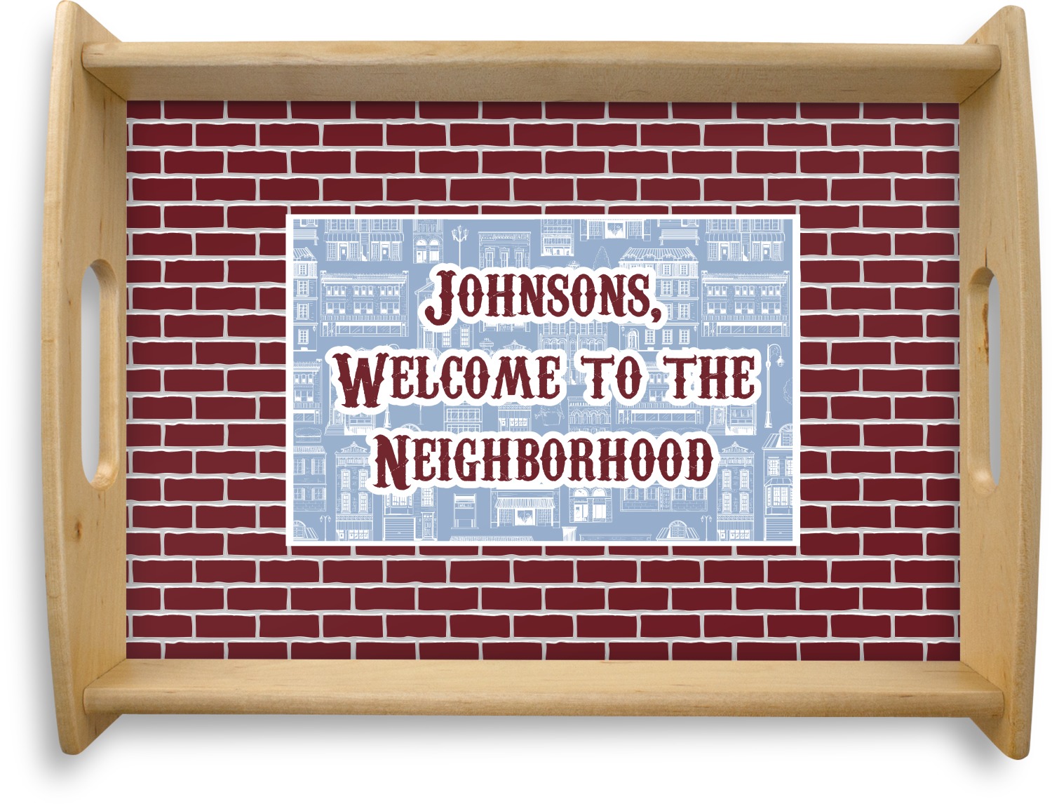 This serving tray with handles features square edges and two rounded sides, creating a very modern look. Each side is fabricated from a beautifully cut, natural wood. The bottom of the interior of the tray displays your customized design in bright, vibrant color. The tray is sold in both a black color and a natural wood look. Each variation of the wood serving tray has two sizes: Small, which is 14" x 10" x 2.25", and Large, which is 19.5" x 13.5" x 2.75".