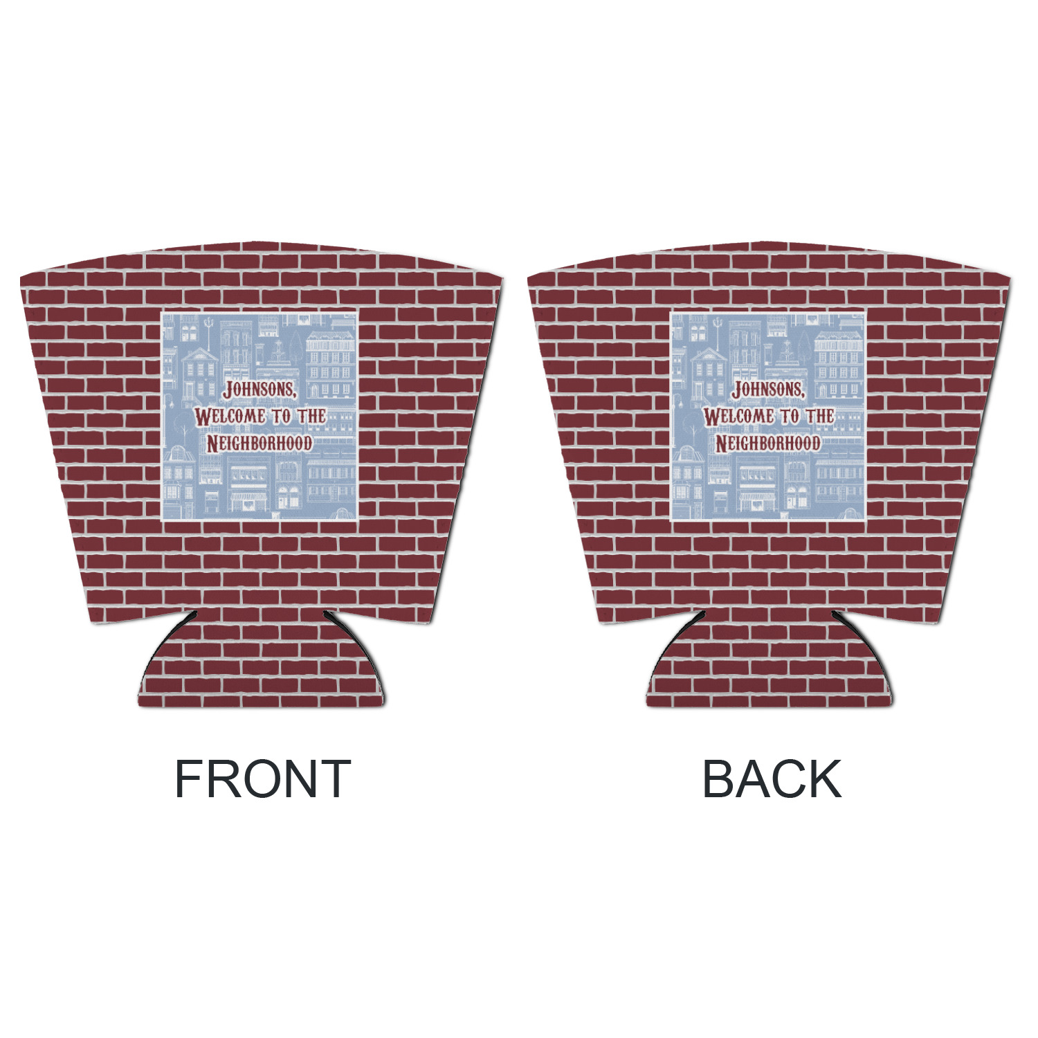 The design has two patterns with one surrounding the other in a square format. The inner pattern is a beautiful light-blue with white illustrations of houses and apartments. The outer design is a warm red brick pattern. The combination of these two patterns makes for a very friendly feeling design. The personalization goes directly in the middle of the inner design. The coordinating pattern has a fun colored graphic of a block of apartments and a place for text underneath.
