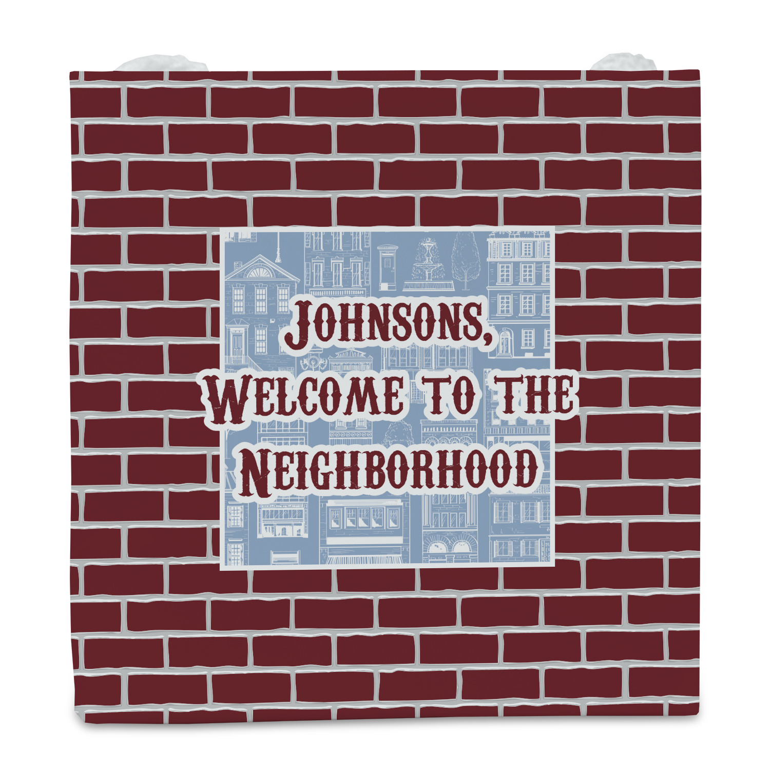 The design has two patterns with one surrounding the other in a square format. The inner pattern is a beautiful light-blue with white illustrations of houses and apartments. The outer design is a warm red brick pattern. The combination of these two patterns makes for a very friendly feeling design. The personalization goes directly in the middle of the inner design. The coordinating pattern has a fun colored graphic of a block of apartments and a place for text underneath.